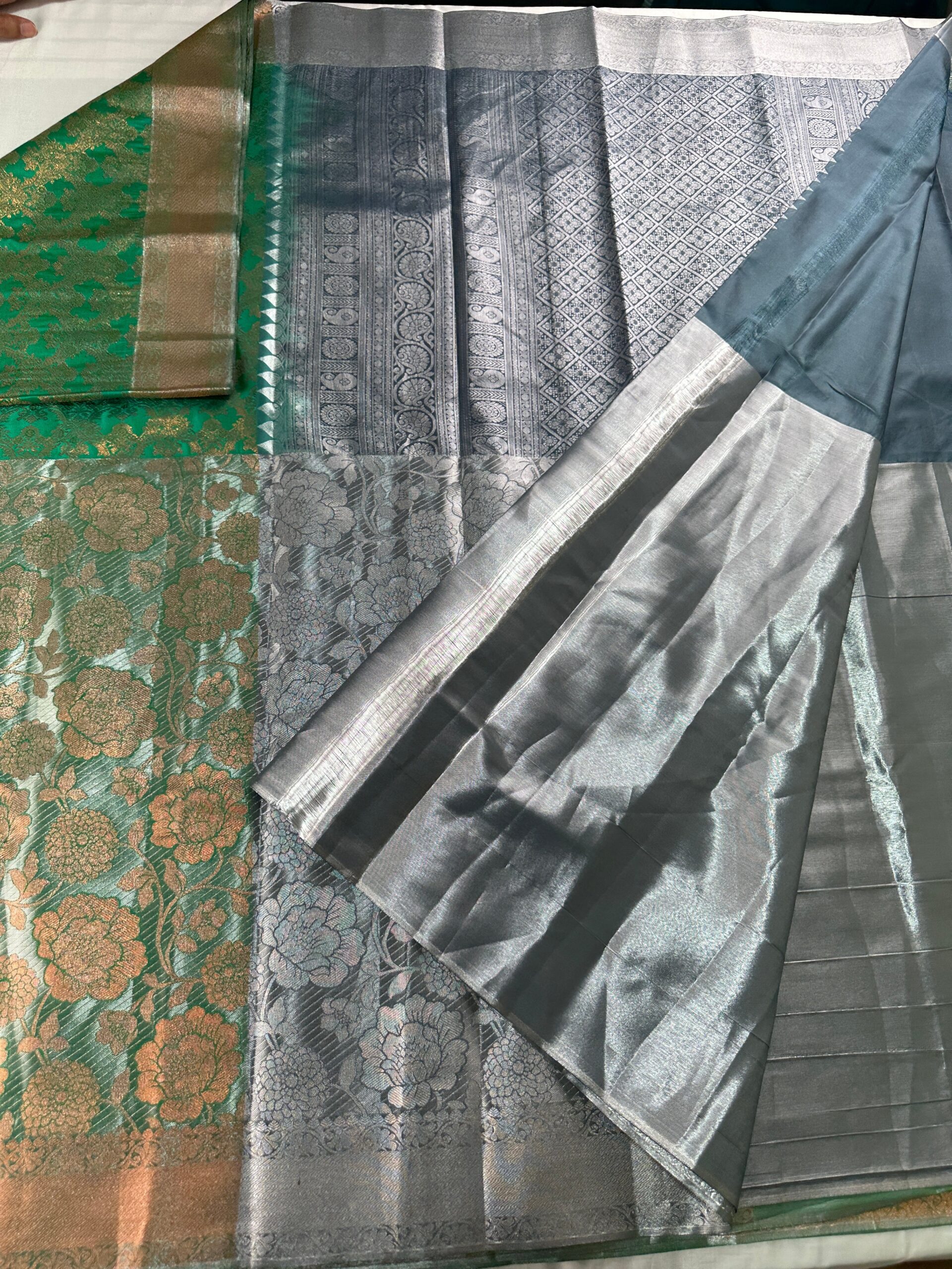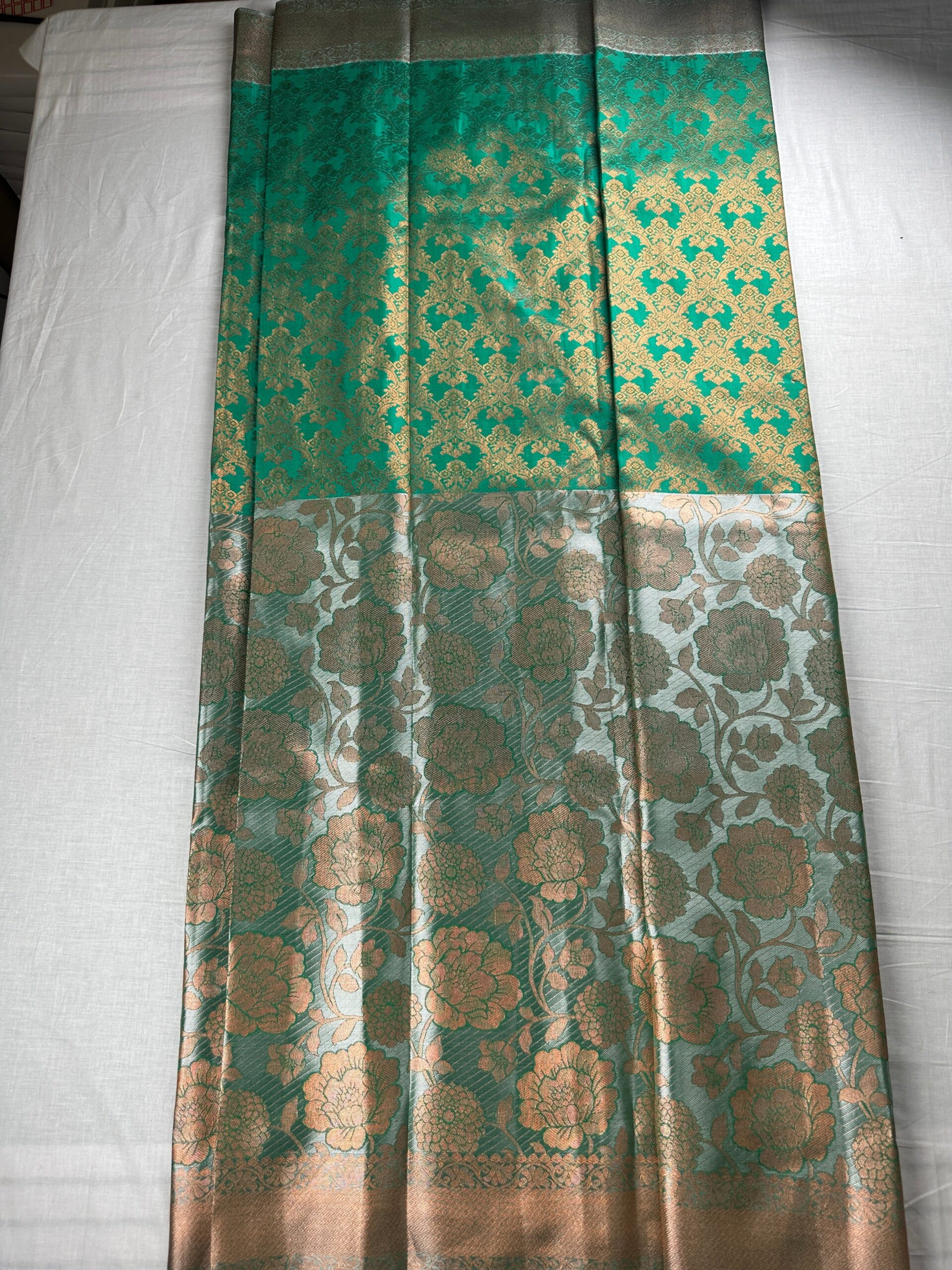 This Amazing Emerald Green Kanjipuram Silk Saree is crafted using premium quality silk and features a Long Boader. The silk fabric offers a luxurious feel, while the long border gives it a timeless look. Perfect for both formal and informal events.