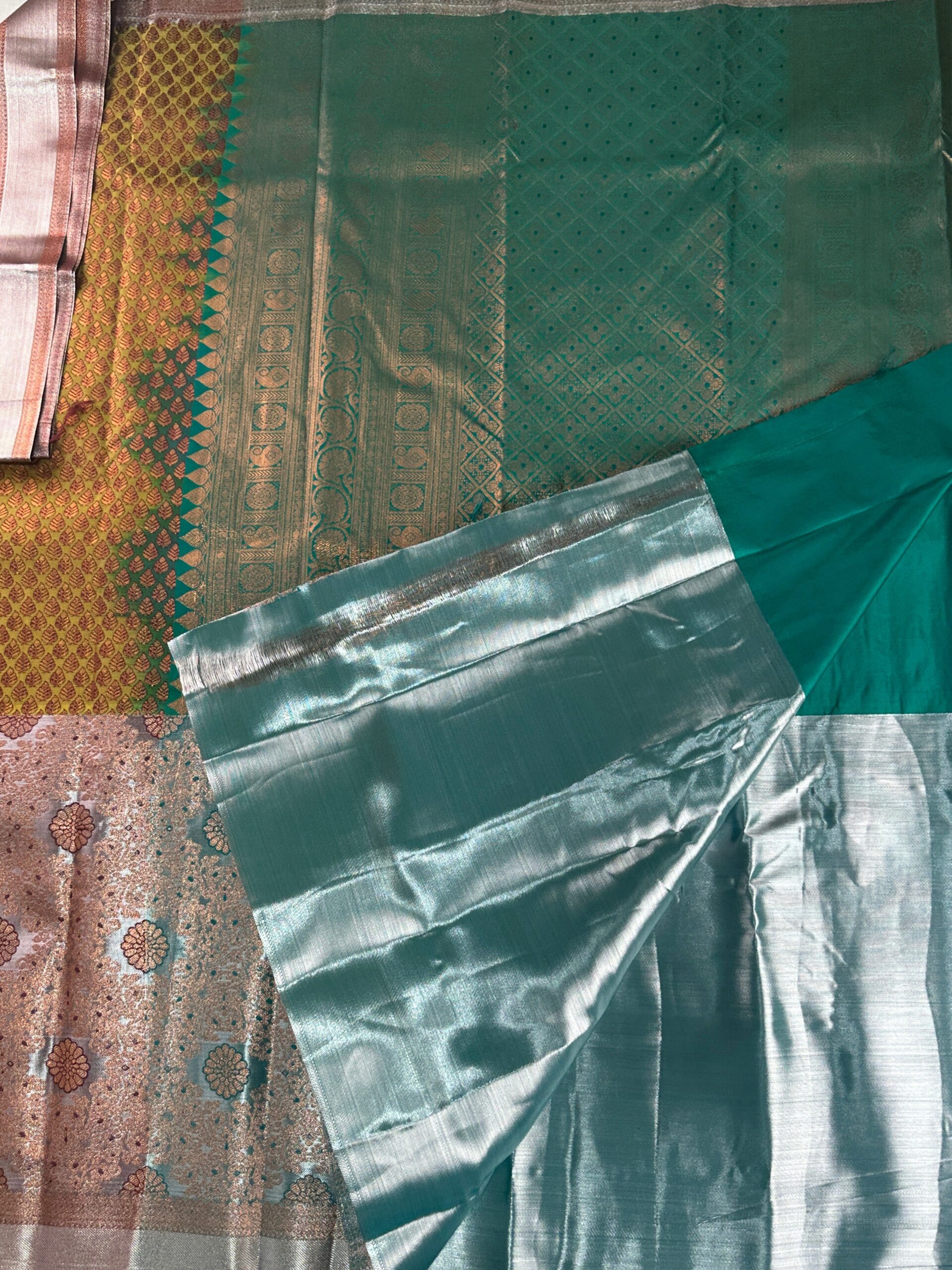 This Amazing Olive Green Kanjipuram Silk Saree will provide you with undeniable luxury and comfort. Crafted from silk, it has a unique texture and drape that is sure to turn heads. It’s also durable and easy to care for, making it ideal for your everyday wardrobe.