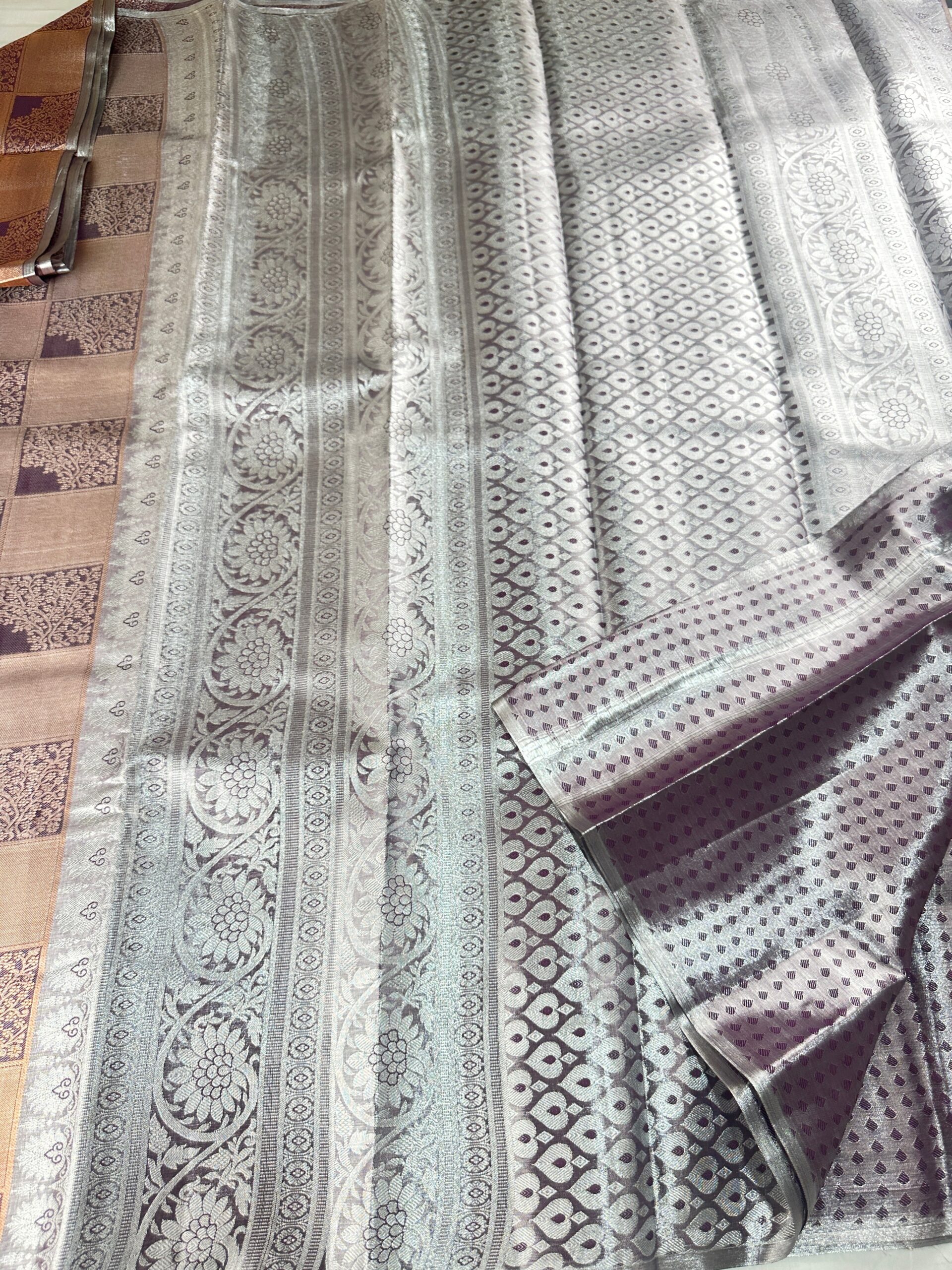 This magnificent purple kanjipuram silk saree is truly stunning. With its authentic silk weave, this saree is sure to make you stand out in any occasion. The luxurious shine of the silk will make you feel glamorous and chic.