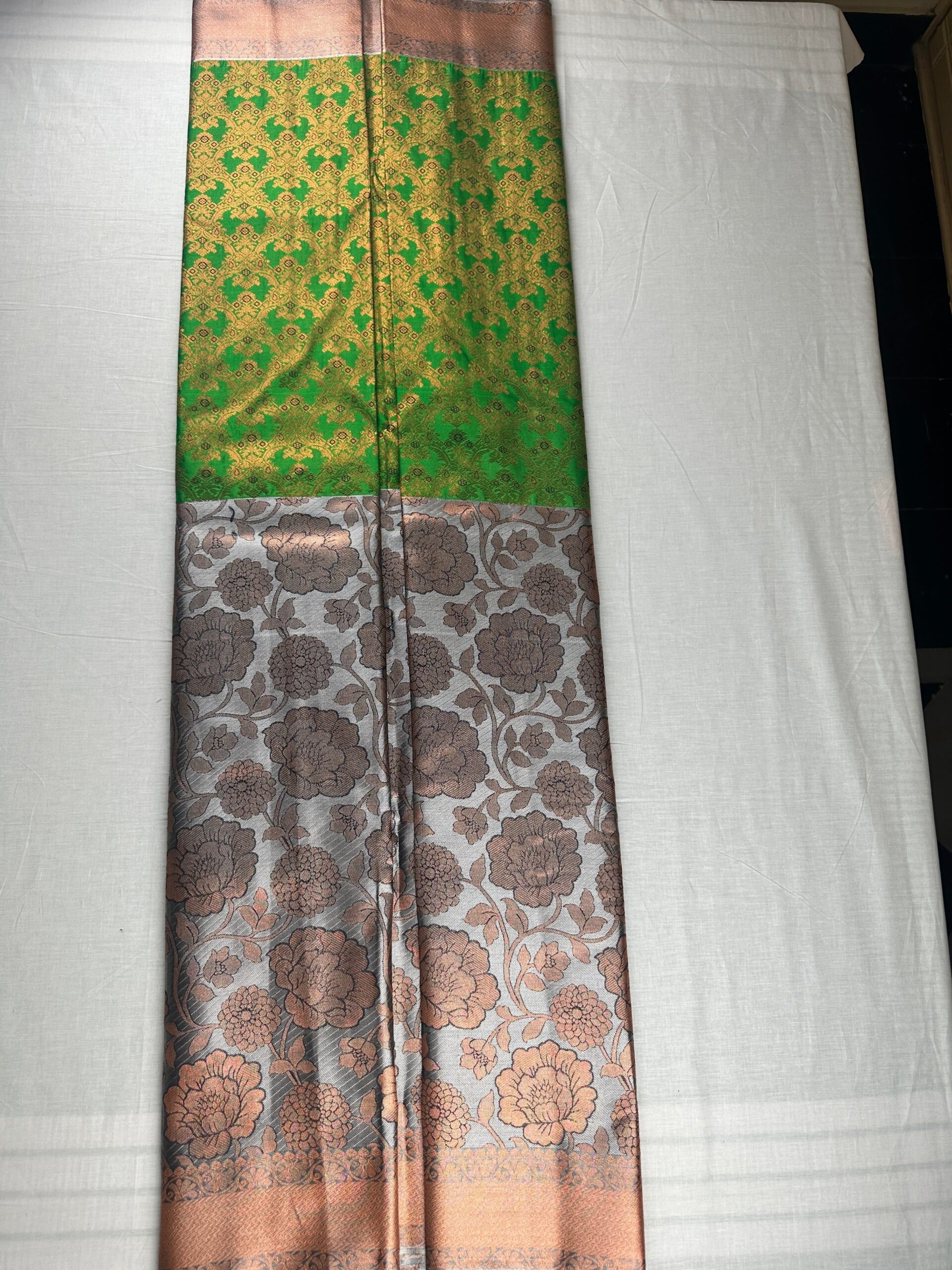 Make a luxurious statement in this Authentic Green Kanjipuram Silk Saree. Crafted from silk, its vibrant hue will draw the eye and its finely spun fabric will glide against your silhouette, providing a comfortable but regal look. Elegant, tasteful, and exclusive, this saree is ideal for achieving an incomparable grandeur at any occasion.