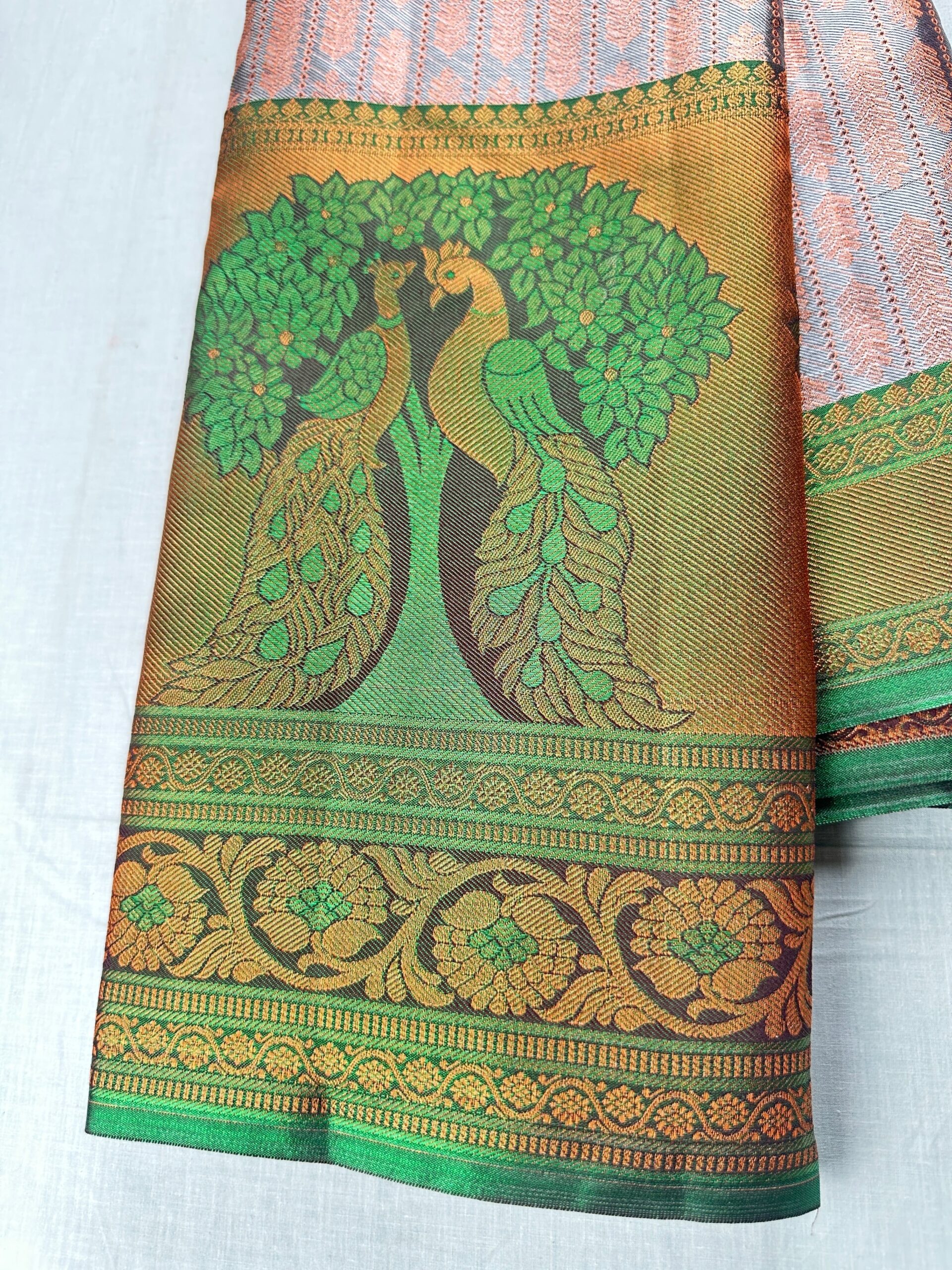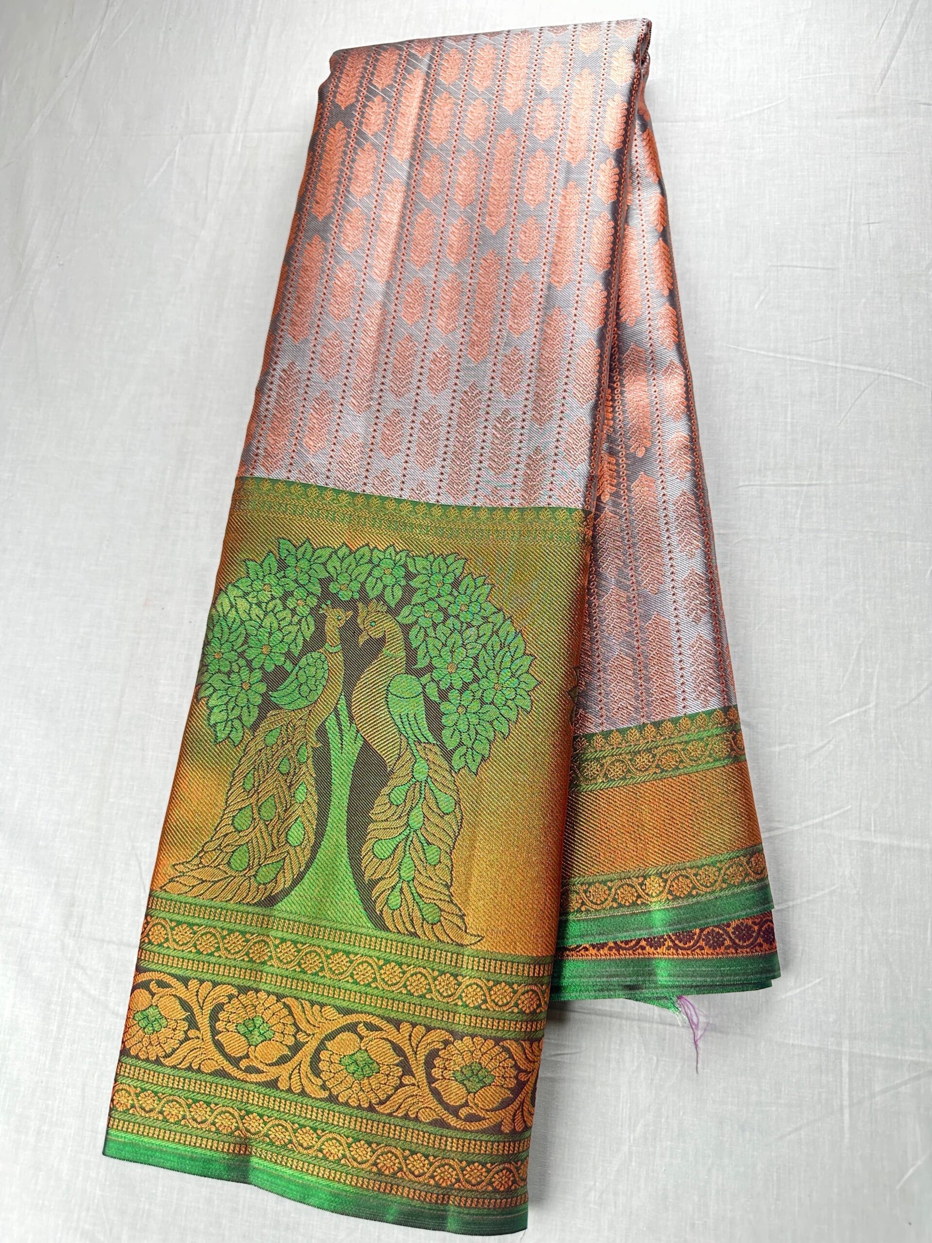 This Classy Grey Kanjipuram Silk Saree is perfect for special occasions. Made of silk, it is lightweight and drapes gracefully, making it a timeless classic. Enjoy the beauty and elegance of this saree and turn heads with your classic, timeless look.