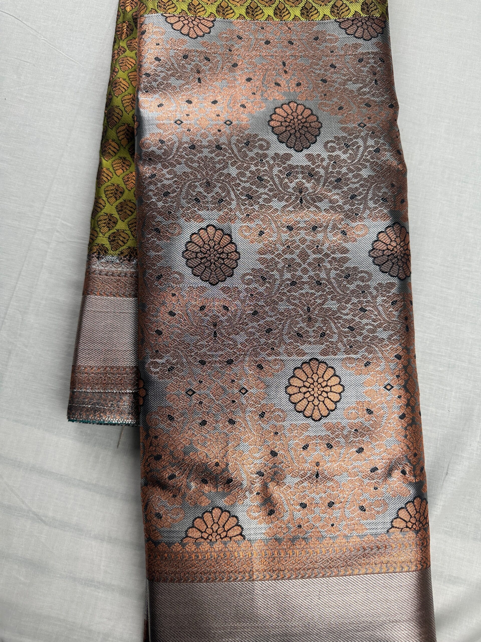 This Classy Olive Green Kanjipuram Silk Saree is made of silk, providing an amazingly soft and comfortable wear. Its classic olive green color will be sure to raise a few eyebrows and draw compliments. Enjoy the beauty of wearing a timeless classic.