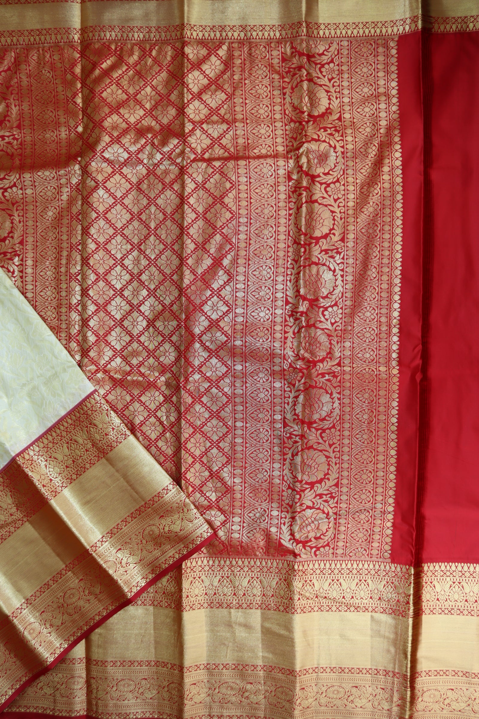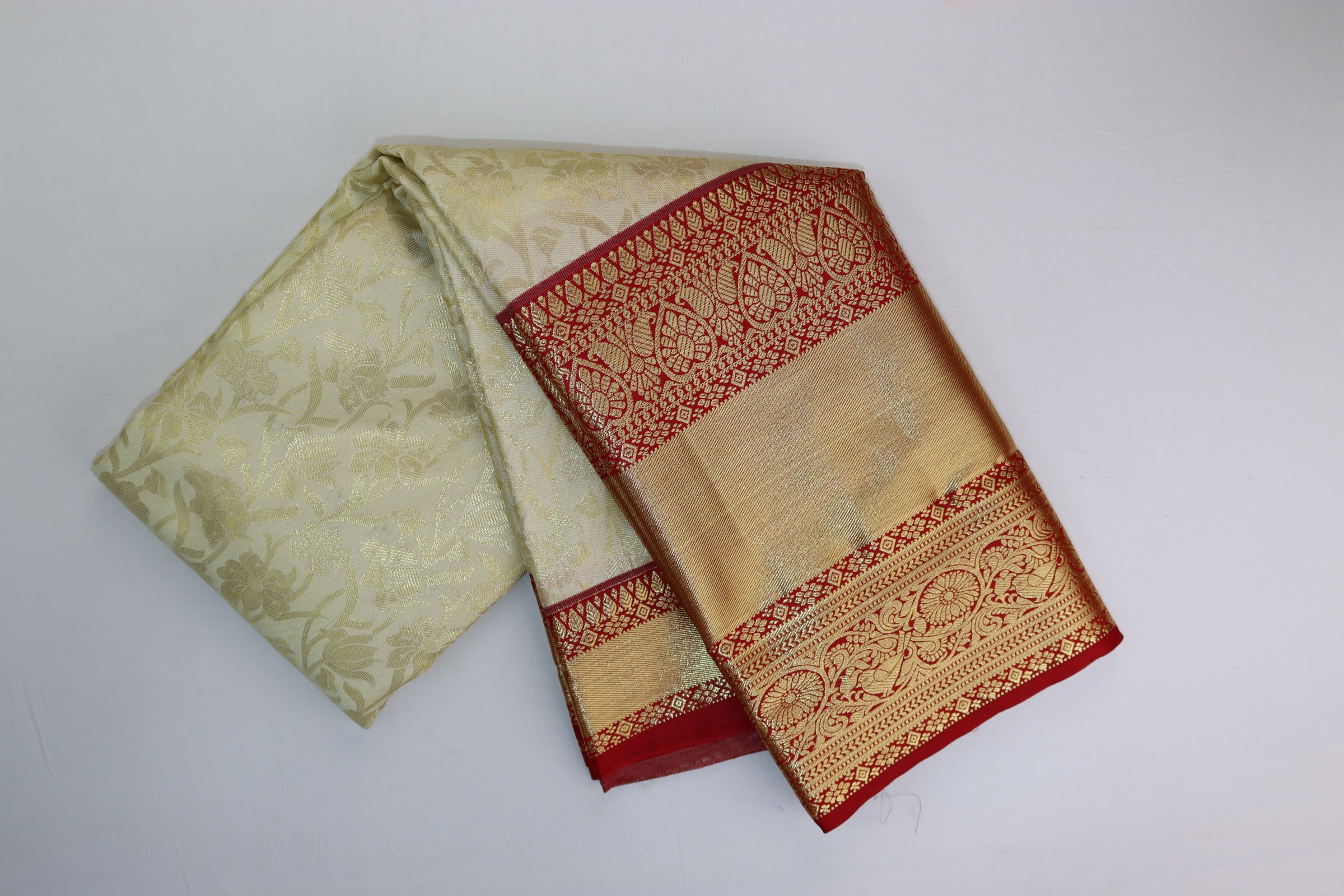This Elegant Cream Kanjipuram Saree is expertly made with high-quality materials, effortlessly blending elegance and comfort. Its lightweight design and luxurious touch make it ideal for any occasion. Comes with a blouse for added versatility.