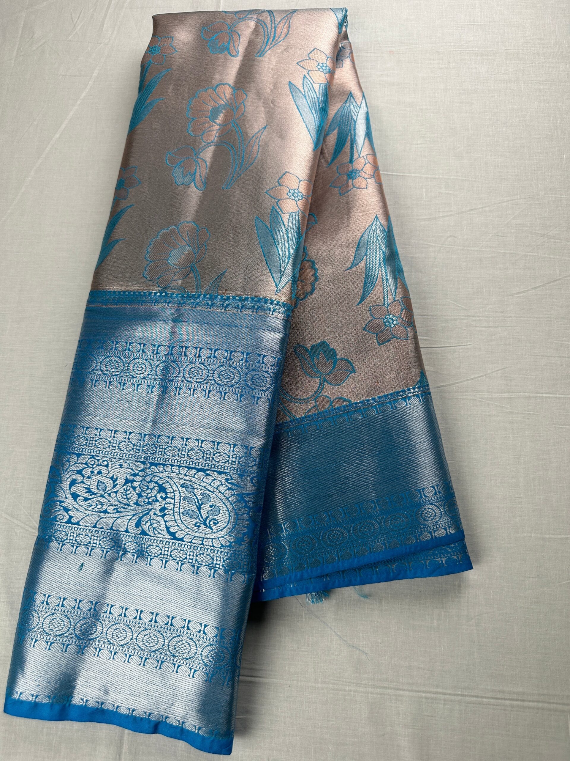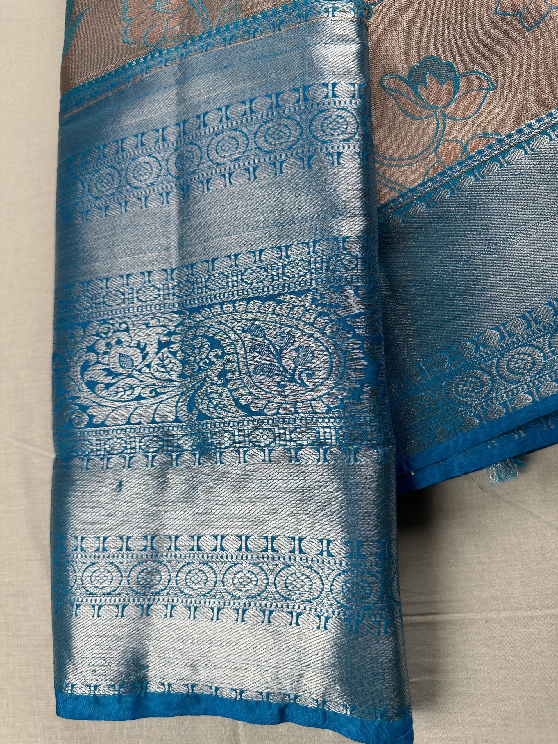 This Exotic Blue on Grey Kanjipuram Silk Saree is perfect for grand occasions. Made from pure silk, the saree has an elegant and sophisticated look that makes it perfect for any formal occasion. The luxurious plain weave of the silk gives a rich texture and drape that is sure to make you stand out.