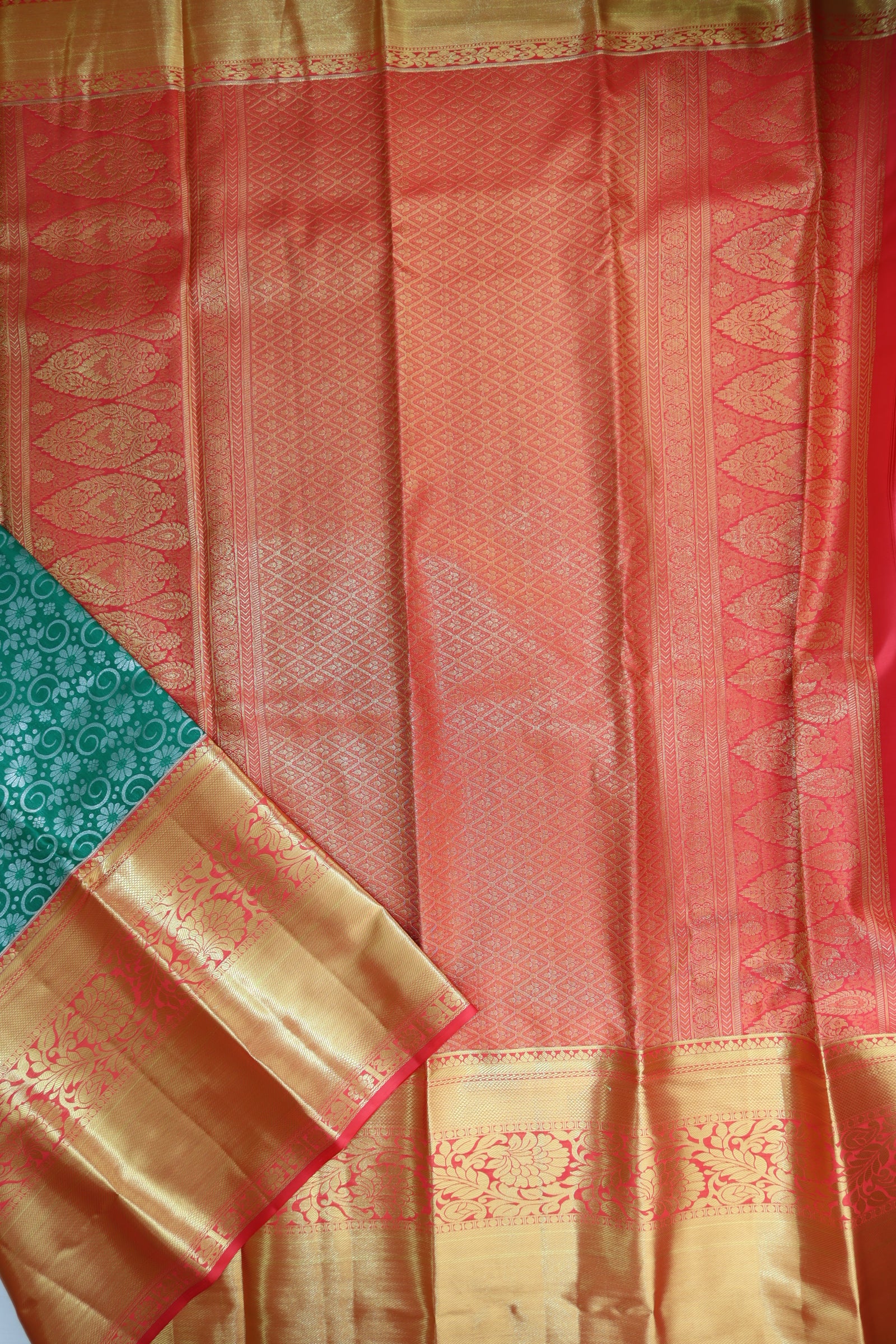 Indulge in luxury with our Exquisite Green Kanjipuram Saree. Meticulously crafted with top-quality materials, this saree effortlessly combines elegance and comfort. Its lightweight fabric and lavish texture make it the perfect choice for any event. Includes blouse for versatile styling.
