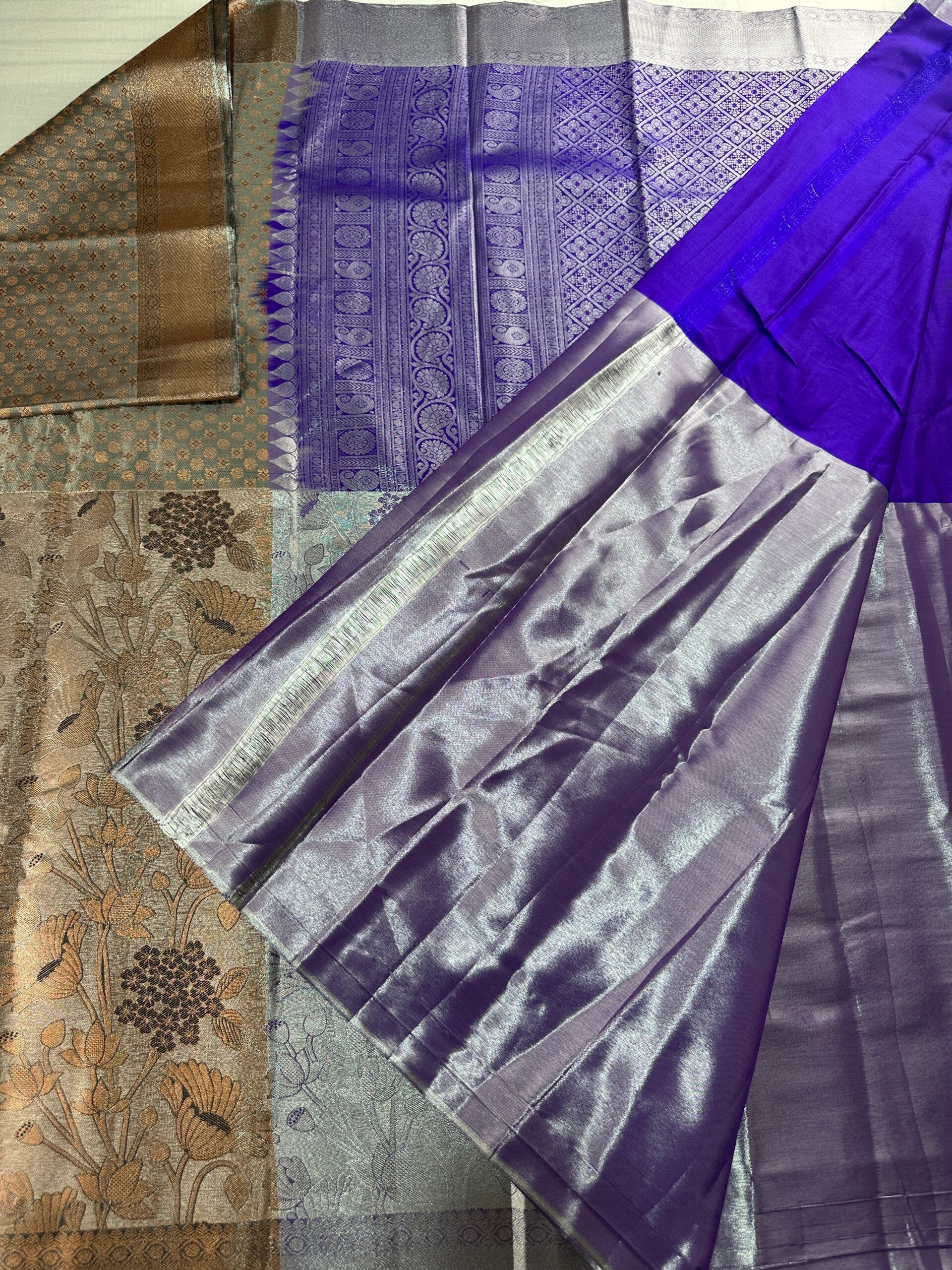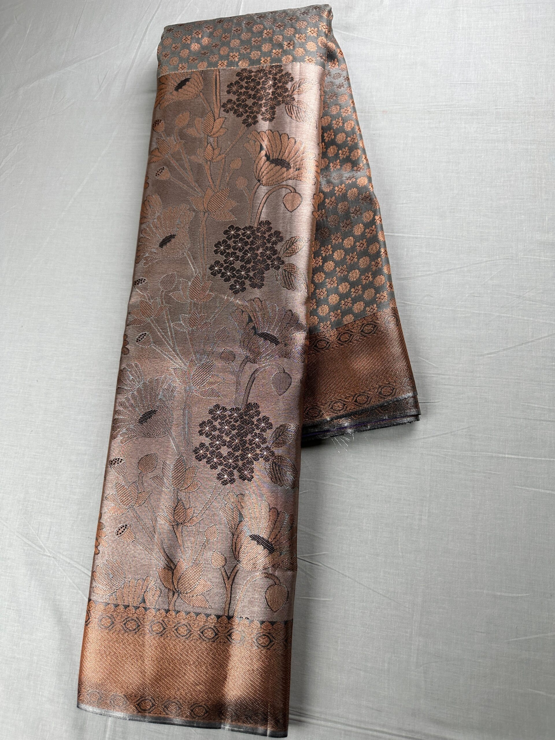 This timeless Graceful Grey Kanjipuram Silk Saree brings elegance to every occasion. This half and half saree radiates luxury. Its intricate handwoven design offers a look of sophistication.