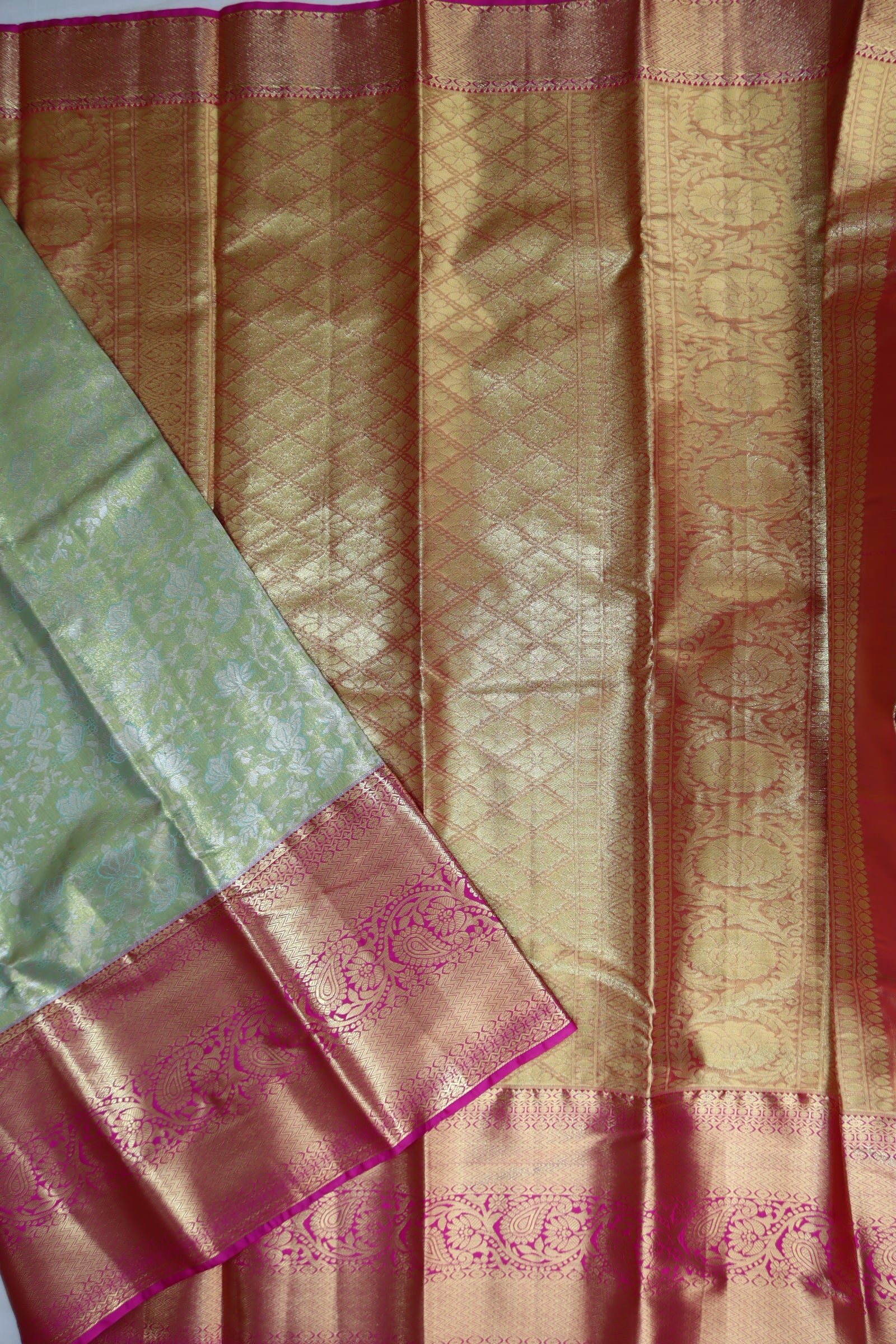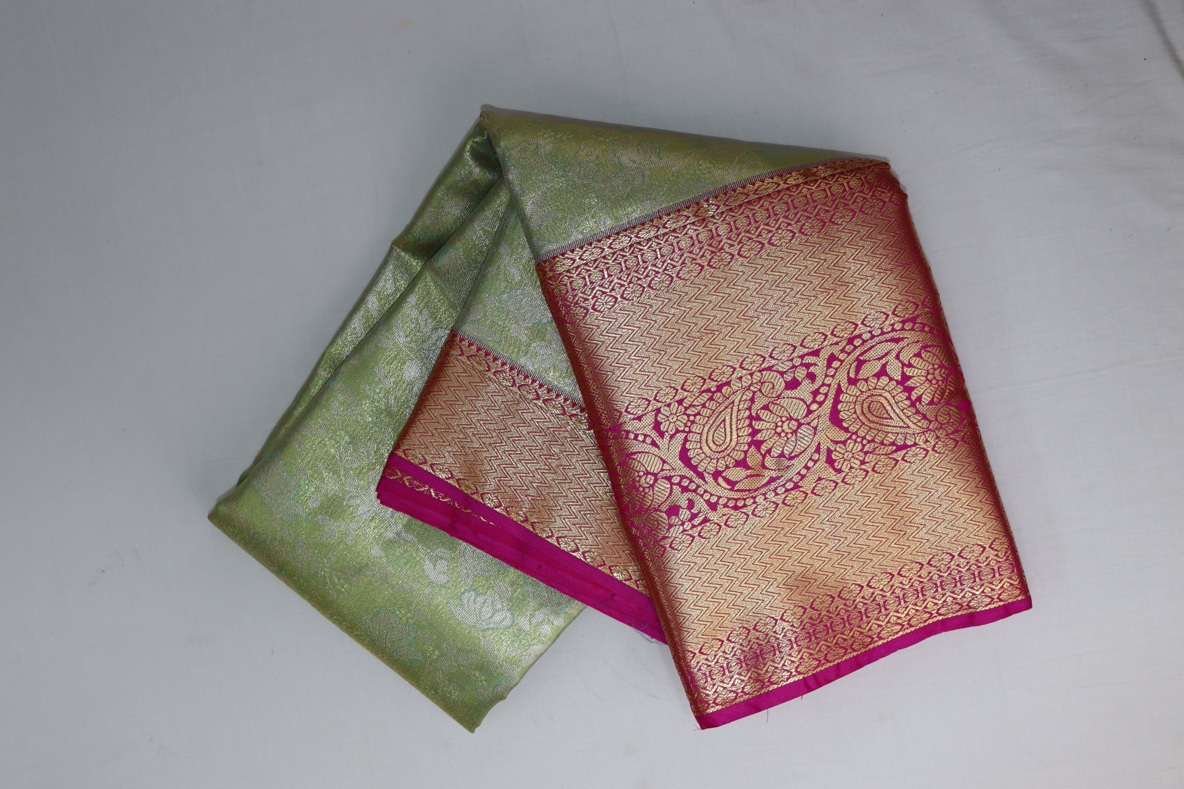 Elevate your style with our Stunning Green Tissue Kanjipuram Saree. Made from high-quality materials, this saree offers sophistication and comfort. The lightweight fabric provides versatility and ease, perfect for any occasion. Comes with a complimentary blouse for added convenience.