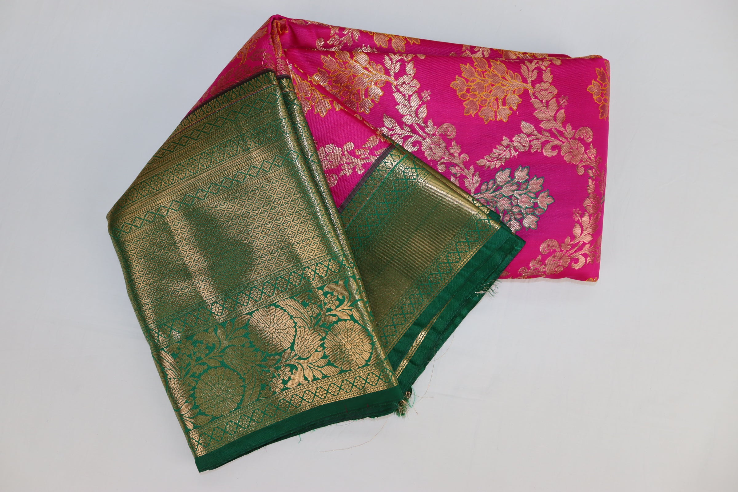 Introducing the Graceful Pink Kanjipuram saree. Elevate your wardrobe with this exquisite and timeless saree, made from premium materials for both style and comfort. Perfect for any occasion, pair it with the versatile blouse for added versatility and sophistication, making it a must-have for all fashion-forward individuals.