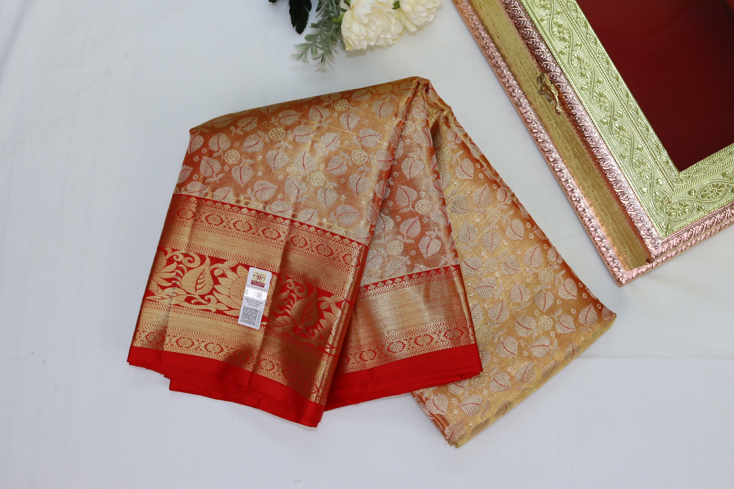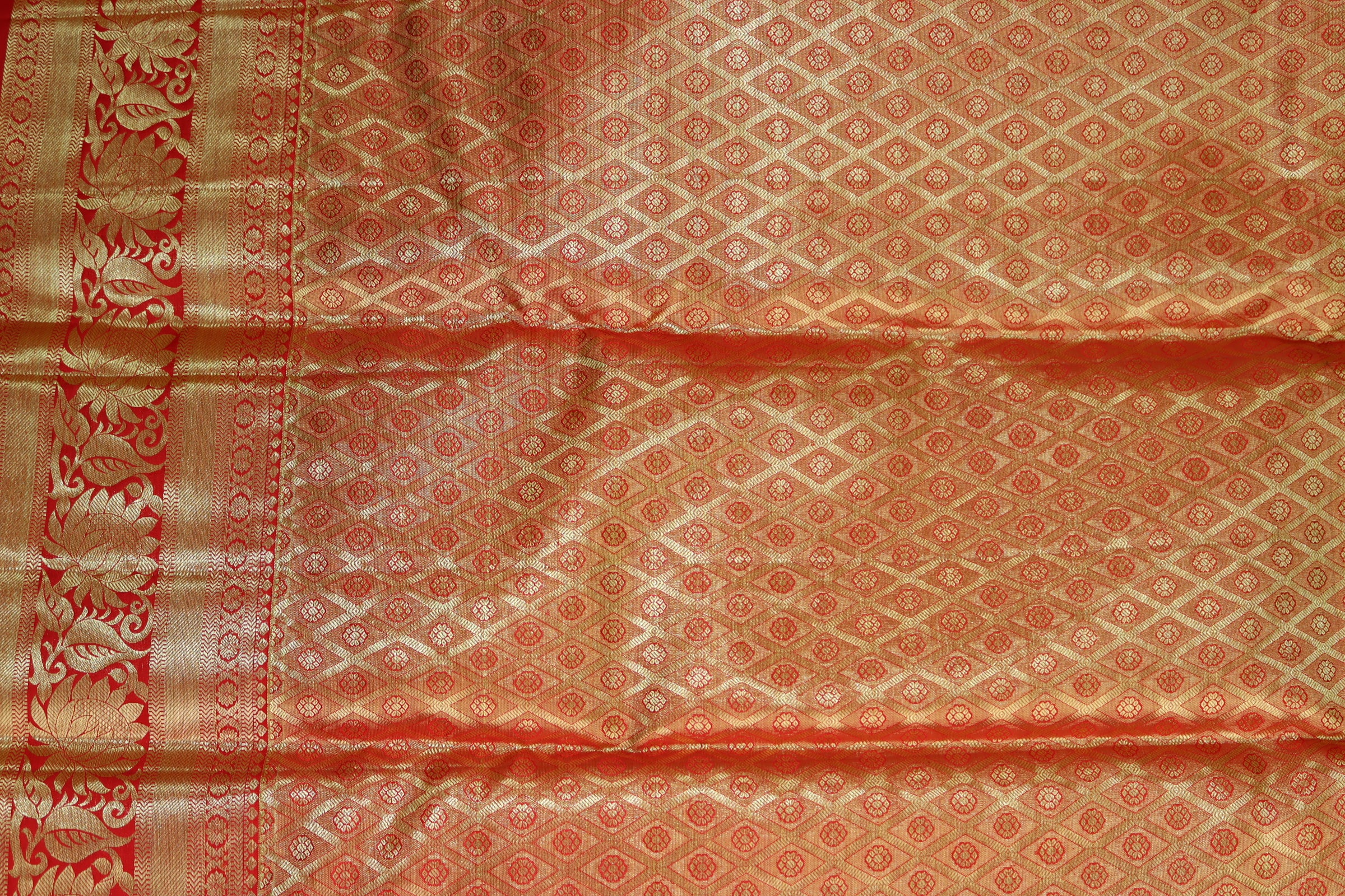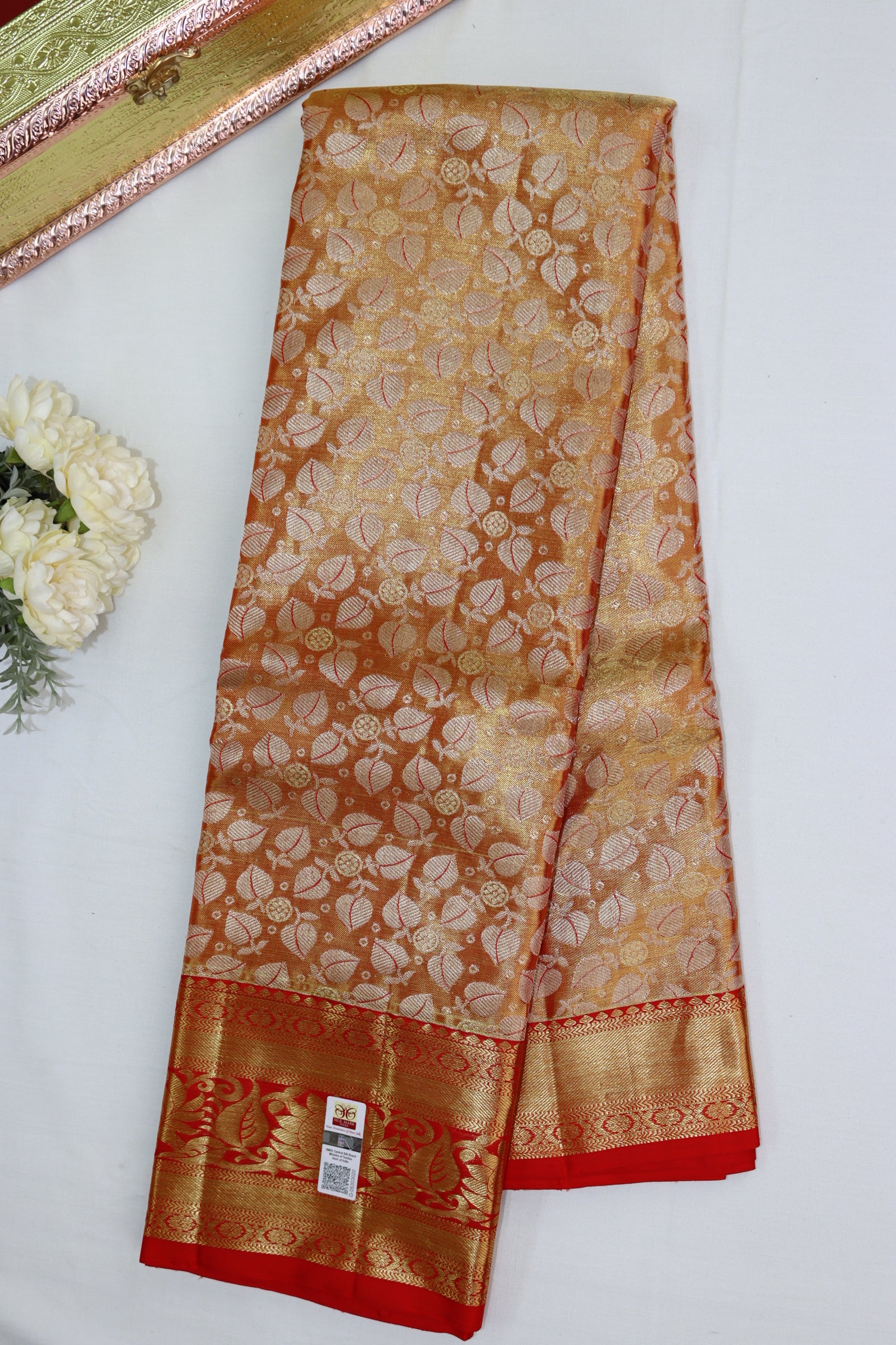 Step up your fashion game with the Luxurious Orange Pure Kanjipuram Saree. Carefully crafted, this gorgeous saree exudes effortless elegance and a comfortable feel thanks to its high-quality fabric. Perfect for any occasion, it comes with a coordinating blouse for a refined and classy look.