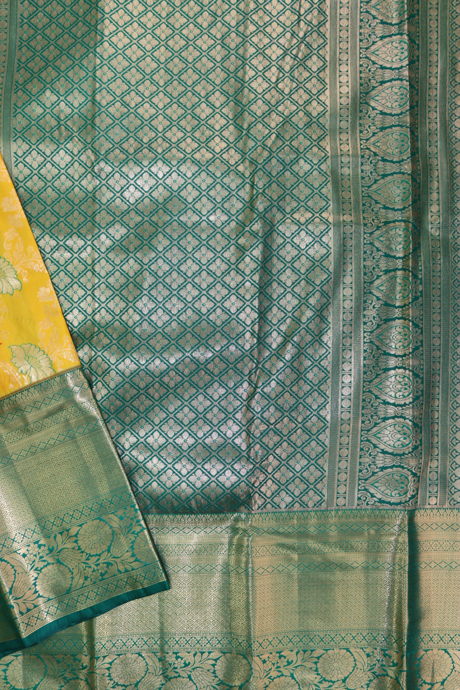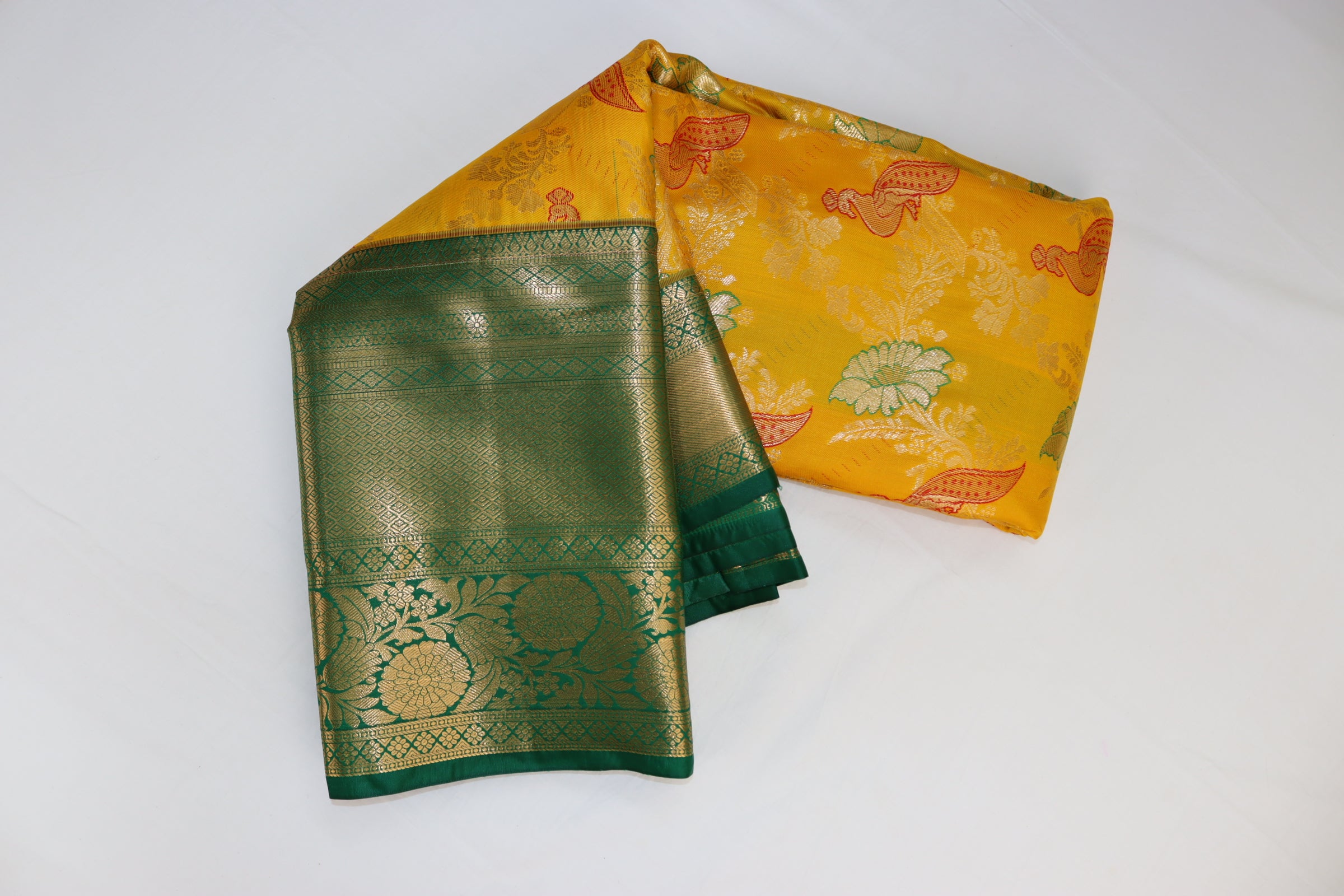 Introducing the mesmerizing yellow Kanjipuram saree. Elevate your wardrobe with this elegant and timeless saree, made with high-quality materials for comfort and style. Perfect for any occasion, pair it with the versatile blouse for added flexibility and grace, making it a must-have for all fashion-forward individuals.