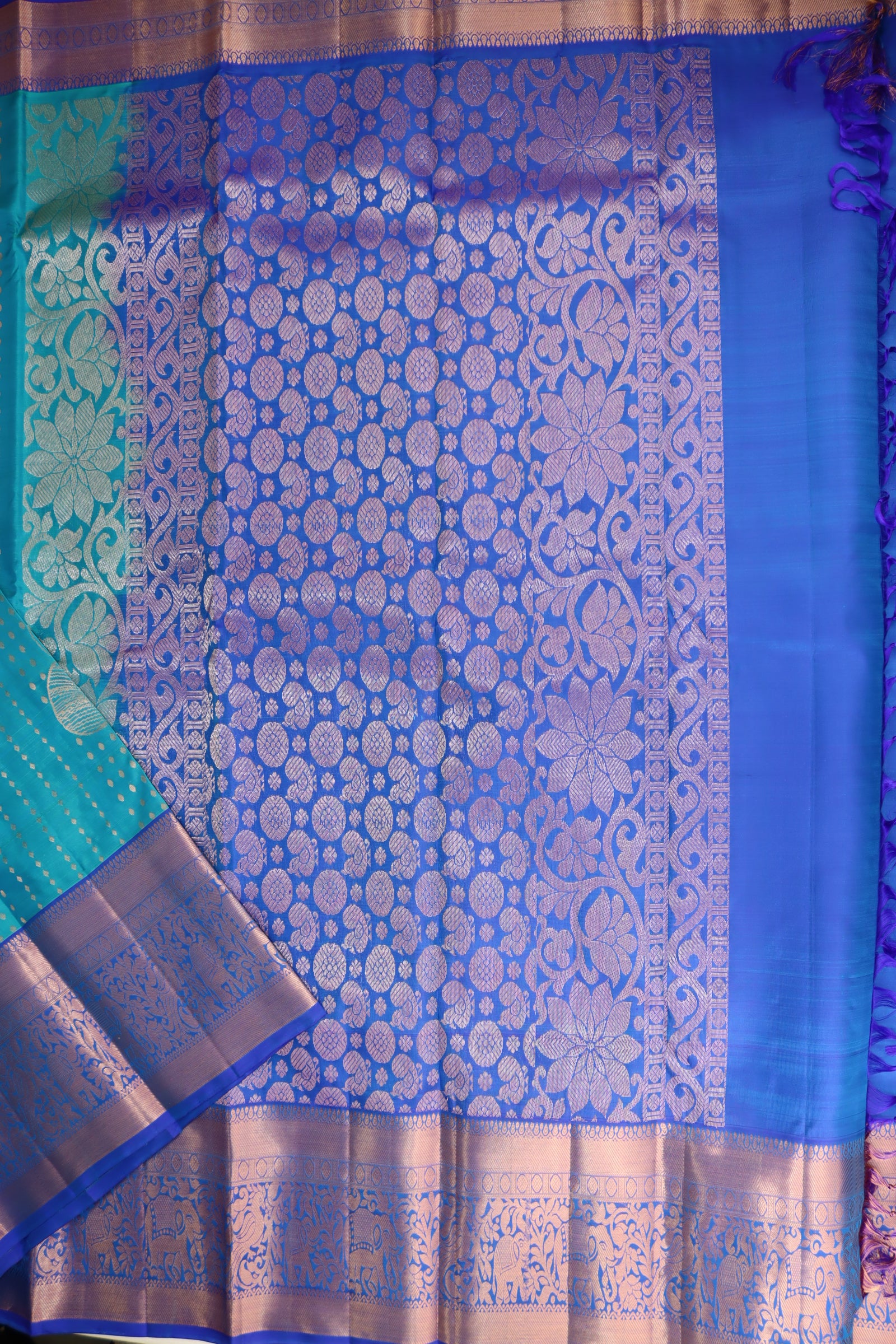 Enhance your outfit with the stunning Radiant Blue Kanjipuram Saree, expertly crafted from premium materials for superior comfort and flexibility. Its elegant pattern is ideal for all occasions and includes a coordinated top. Elevate your style with this luxurious and refined saree, a must-have for industry experts.