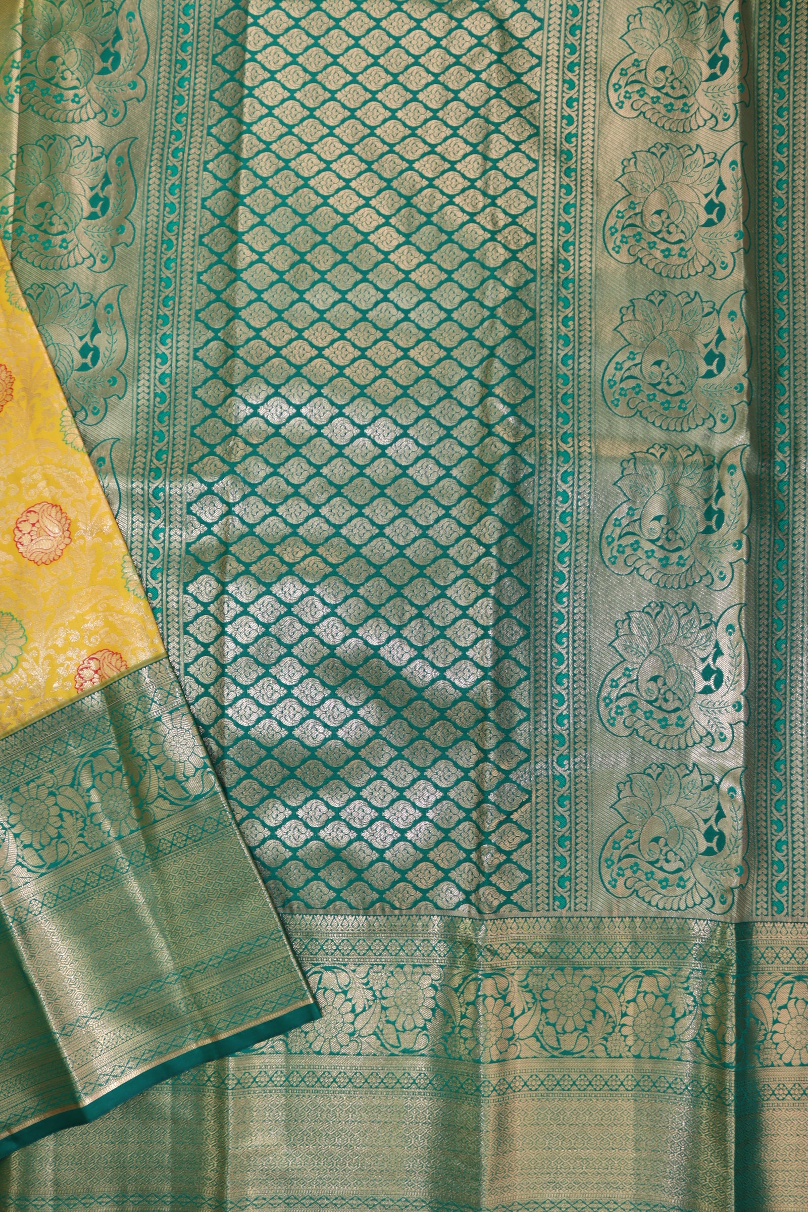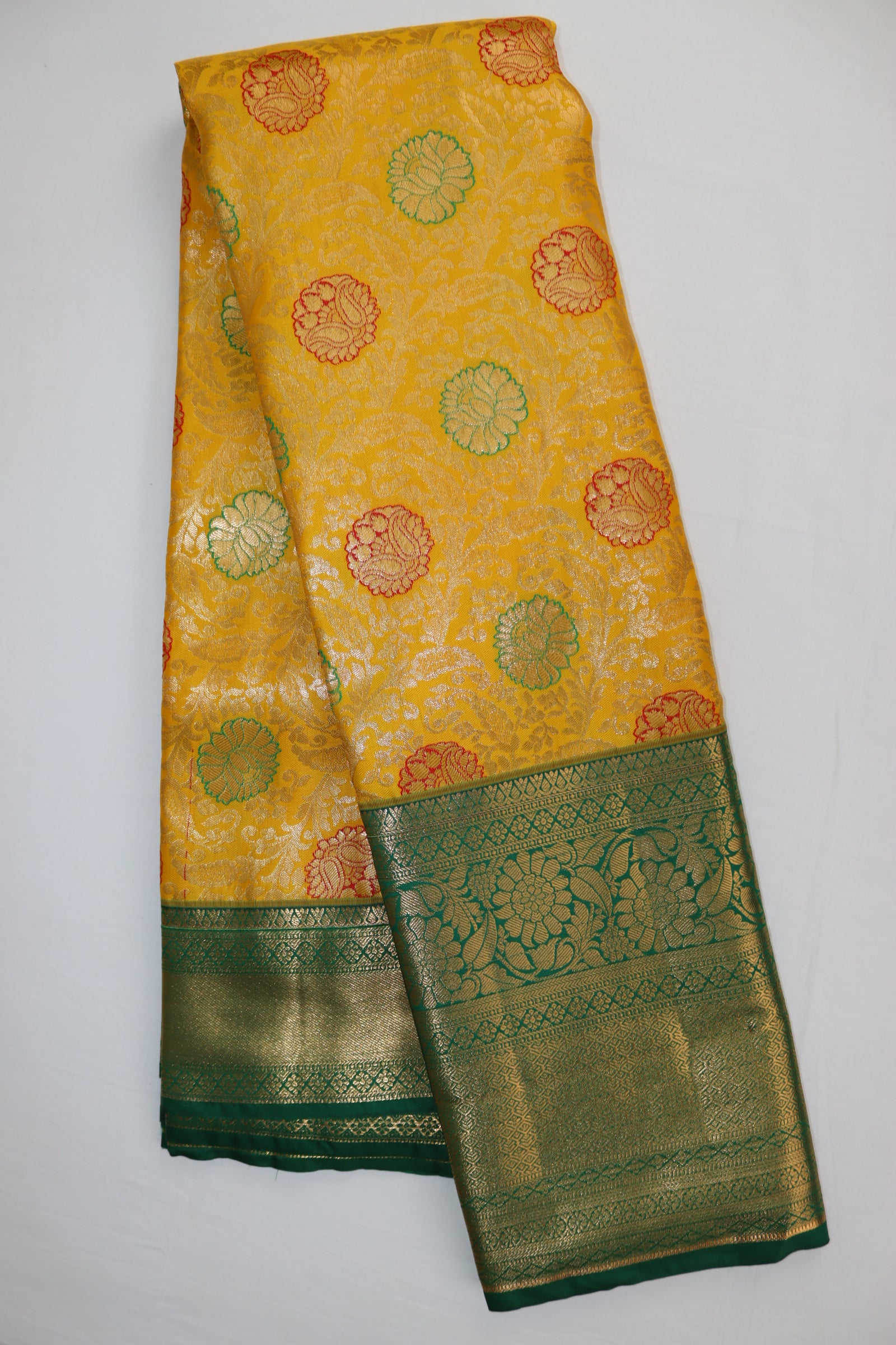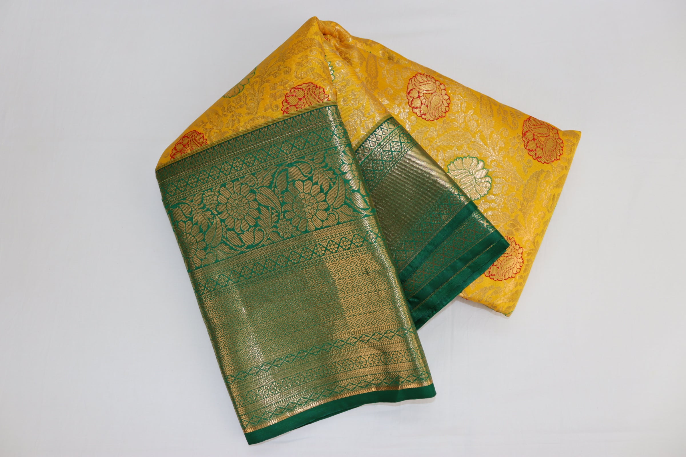 Introducing the captivating yellow Kanjipuram saree. Enhance your wardrobe with this exquisite and classic saree, crafted from top-notch materials for both comfort and fashion. Ideal for any gathering, combine it with the versatile blouse for added versatility and elegance, making it essential for all trend-savvy individuals.