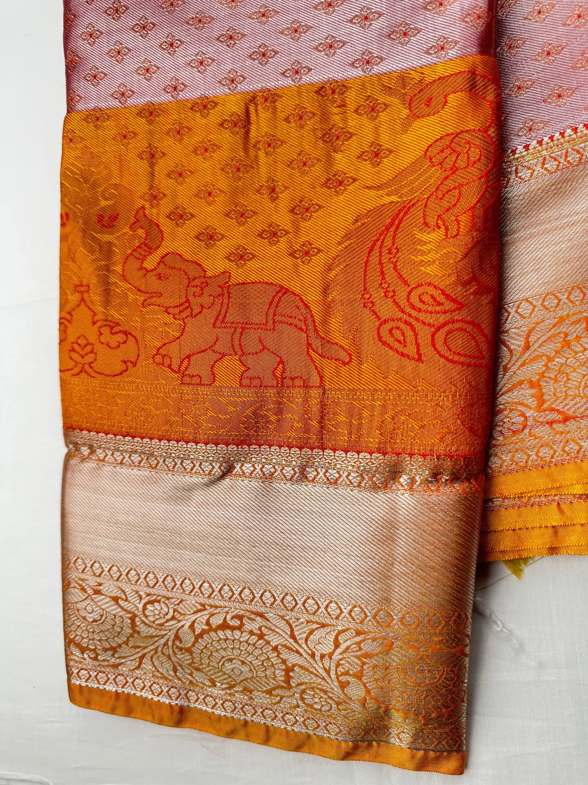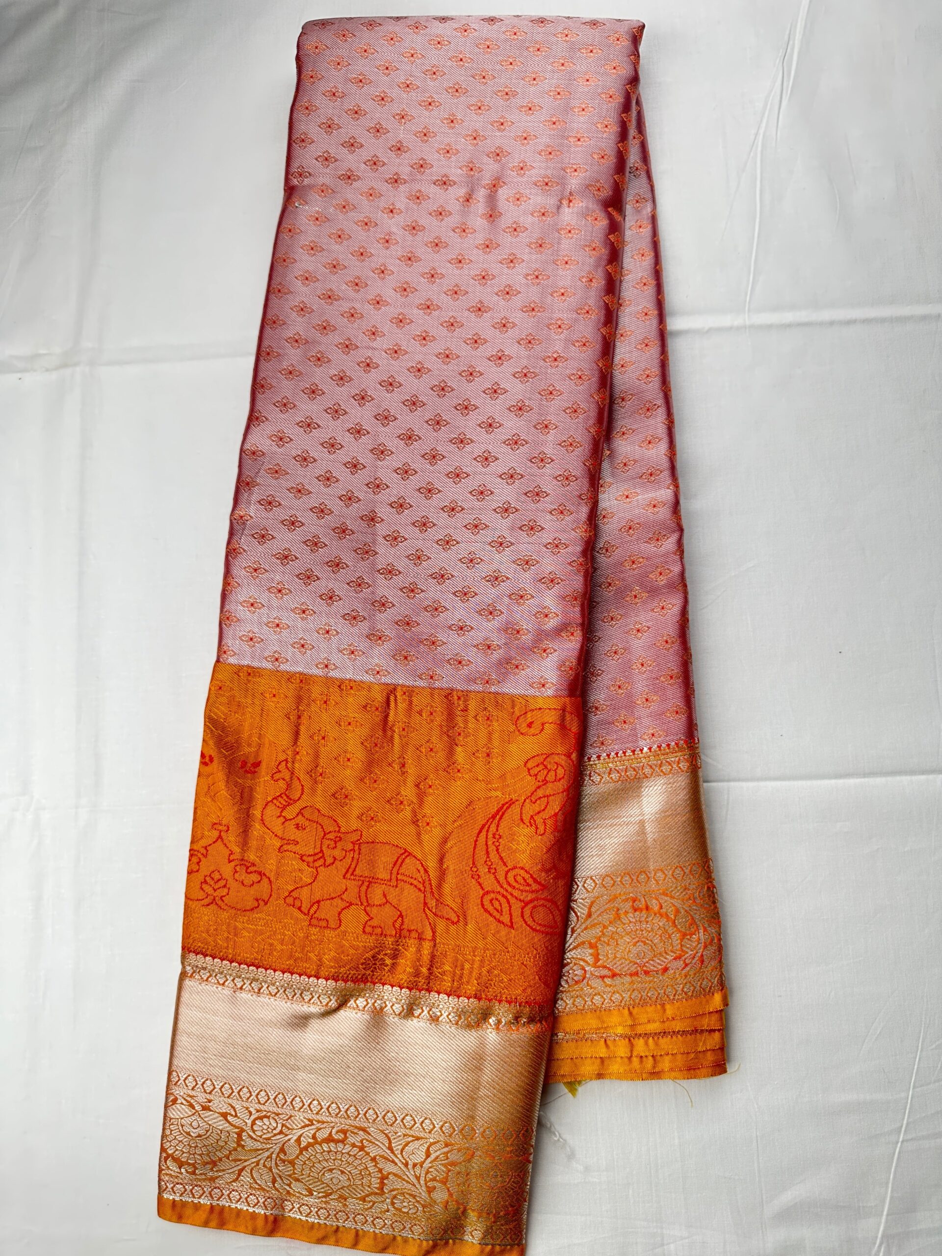 Enjoy the shimmer and shine of this Rich Pink Kanjipuram Silk Saree. Crafted from pure silk fibers, this saree is perfect for dressing up or down. Its luxurious texture and sheen make it a timelessly elegant piece for any wardrobe.