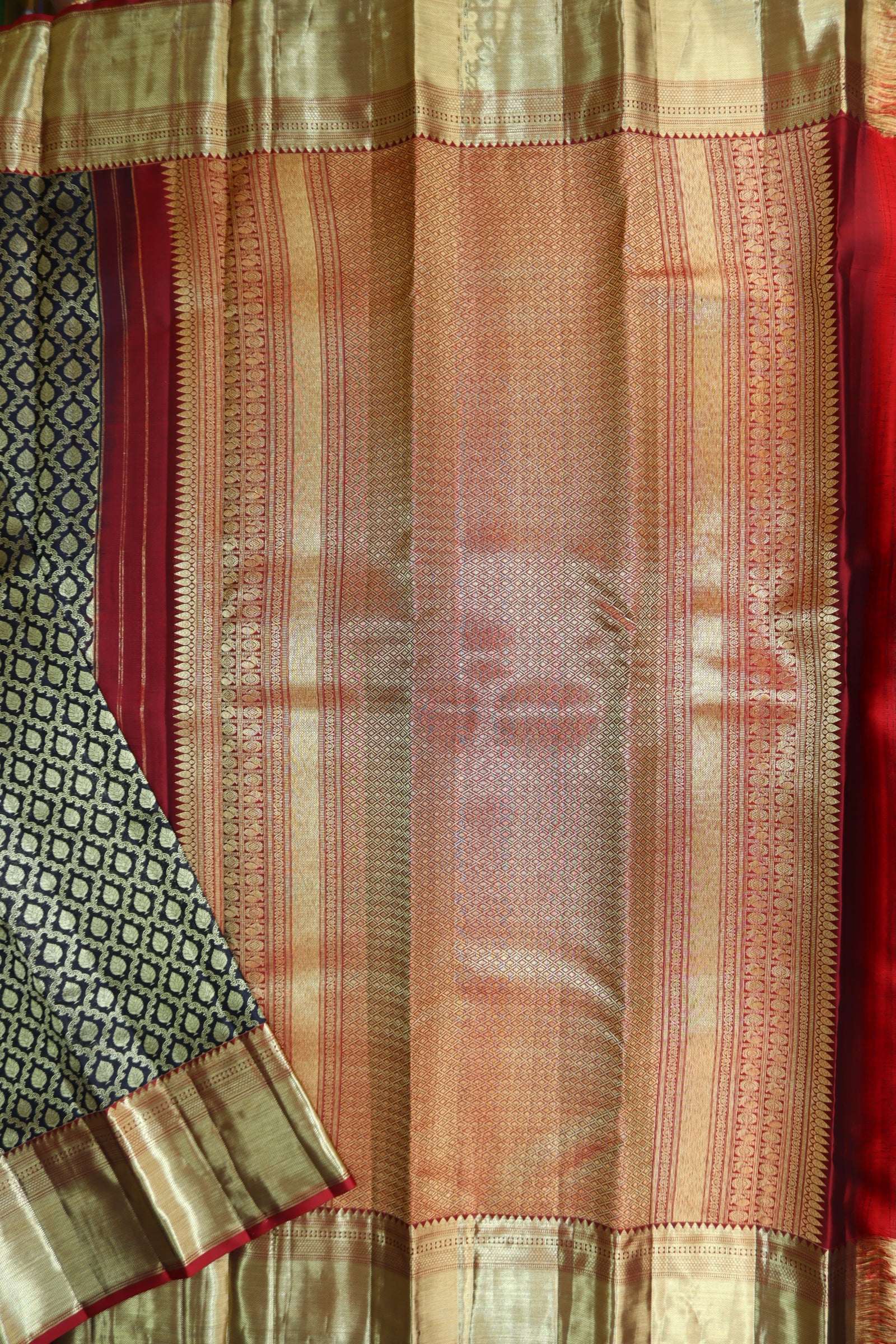 Upgrade your style with our Gorgeous Black Kanjipuram Saree. Crafted from premium materials, it effortlessly combines sophistication and comfort. Its lightweight design and luxurious feel make it suitable for any event. Complete with a blouse for versatility. Order now and elevate your fashion game.
