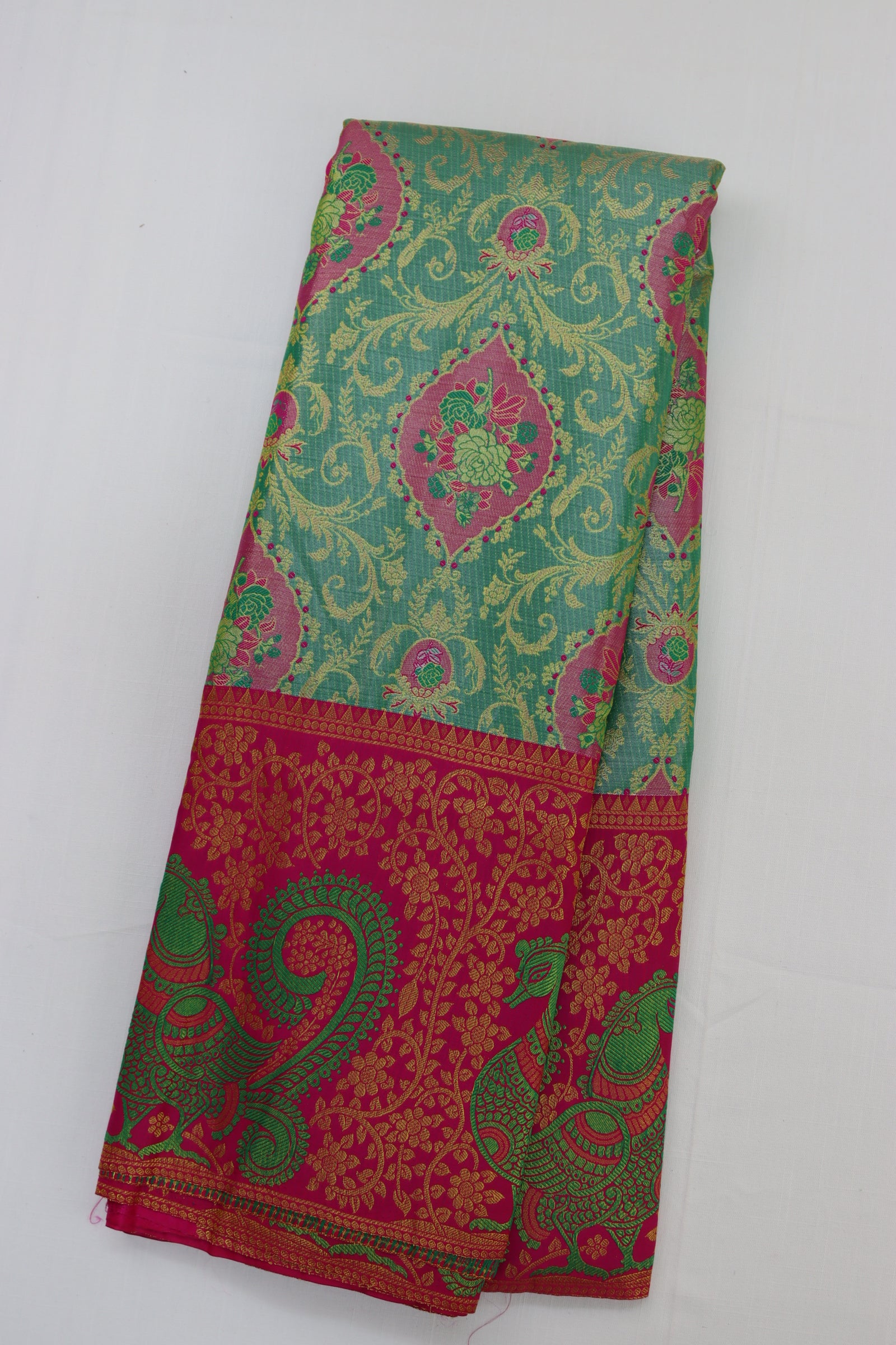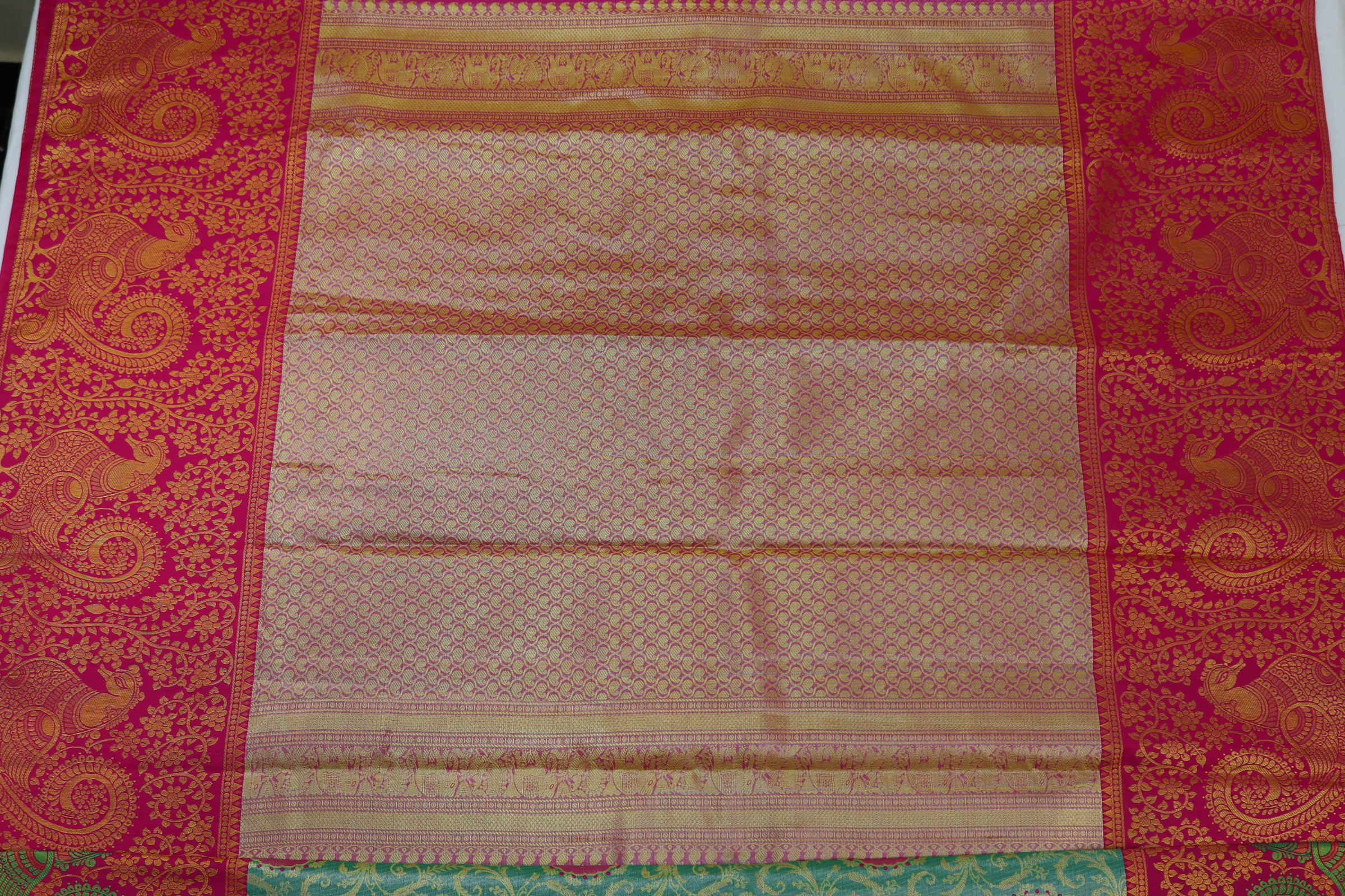 Step into elegance with our royal Green Kanjipuram Saree. Made with quality materials, this saree offers unparalleled comfort and sophistication. Its timeless design, versatile blouse, and eye-catching color make it perfect for any occasion. Make a statement and stand out with this elegant saree. Elevate your style today.