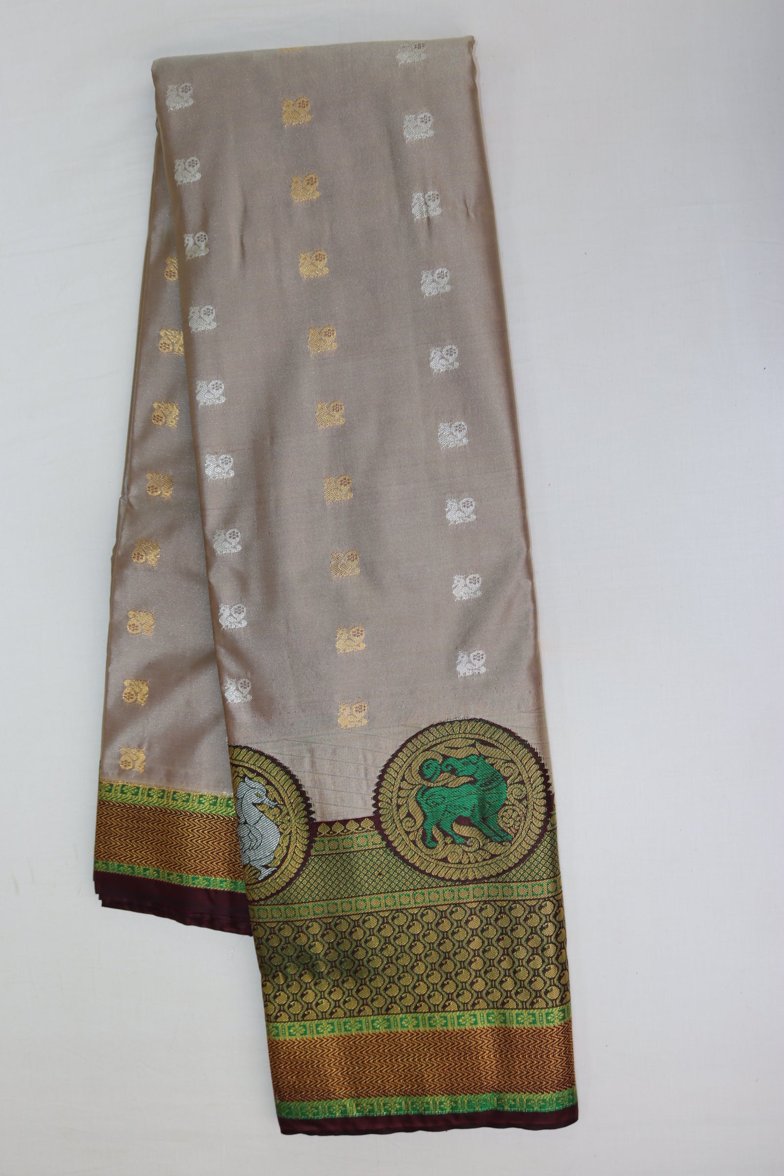 This Stunning Brown Kanjipuram Saree exudes timeless elegance and exceptional craftsmanship with its use of high-quality materials. The impeccable blend of style and comfort makes it a sophisticated choice for any event. Complete with a versatile blouse, this saree is a must-have for your wardrobe.