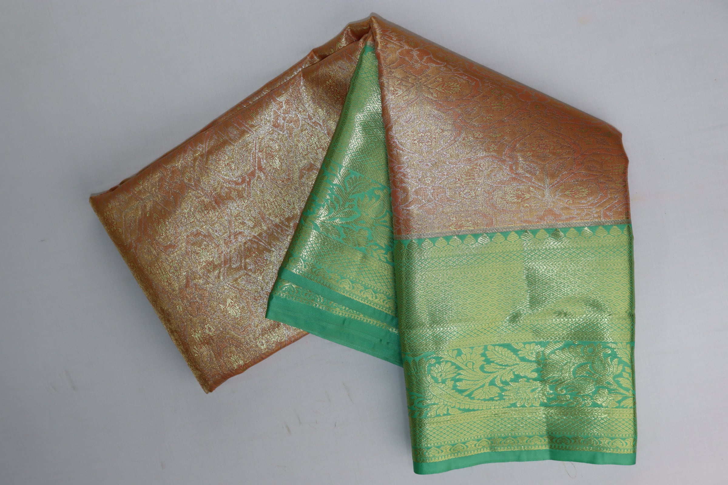 Indulge in the lavish elegance of our Peach Kanjipuram Saree. Crafted by skilled artisans, this saree boasts intricate details and high-quality materials. Its lightweight fabric offers both style and comfort, making it a versatile choice for any occasion. Complete your refined look with the expertly tailored blouse.