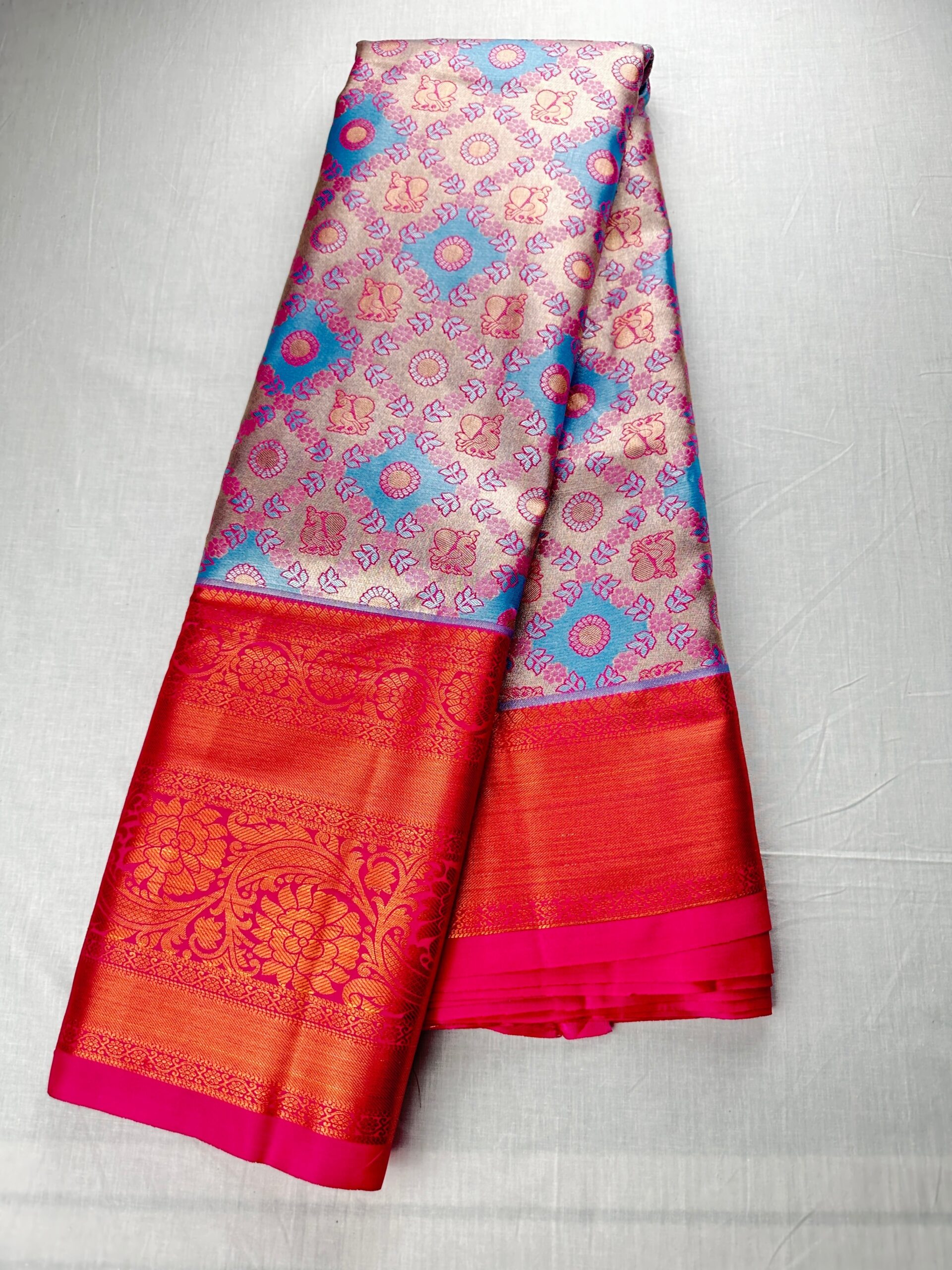 Crafted from finely-woven silk, this Timeless Multi-color Kanjipuram Silk Saree is sure to make you stand out in the crowd. Comfortably lightweight and durable, it’s the perfect addition to any wardrobe.