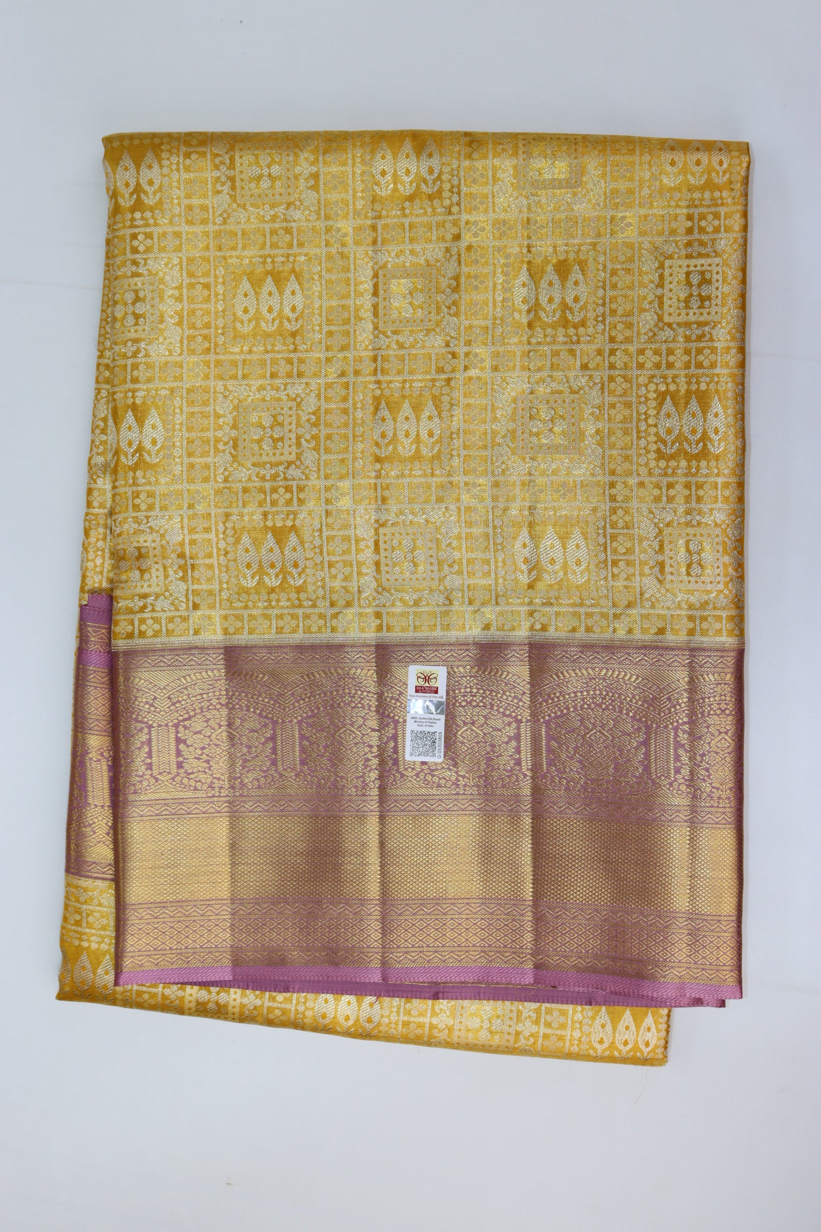 Expertly crafted and intricately designed, this Traditional Gold Pure Kanjipuram Saree is a must-have addition to any traditional wardrobe. Made from high-quality material, it offers a timeless elegance and effortless style. With its vibrant colors and exquisite craftsmanship, this saree is sure to make a statement at any occasion.