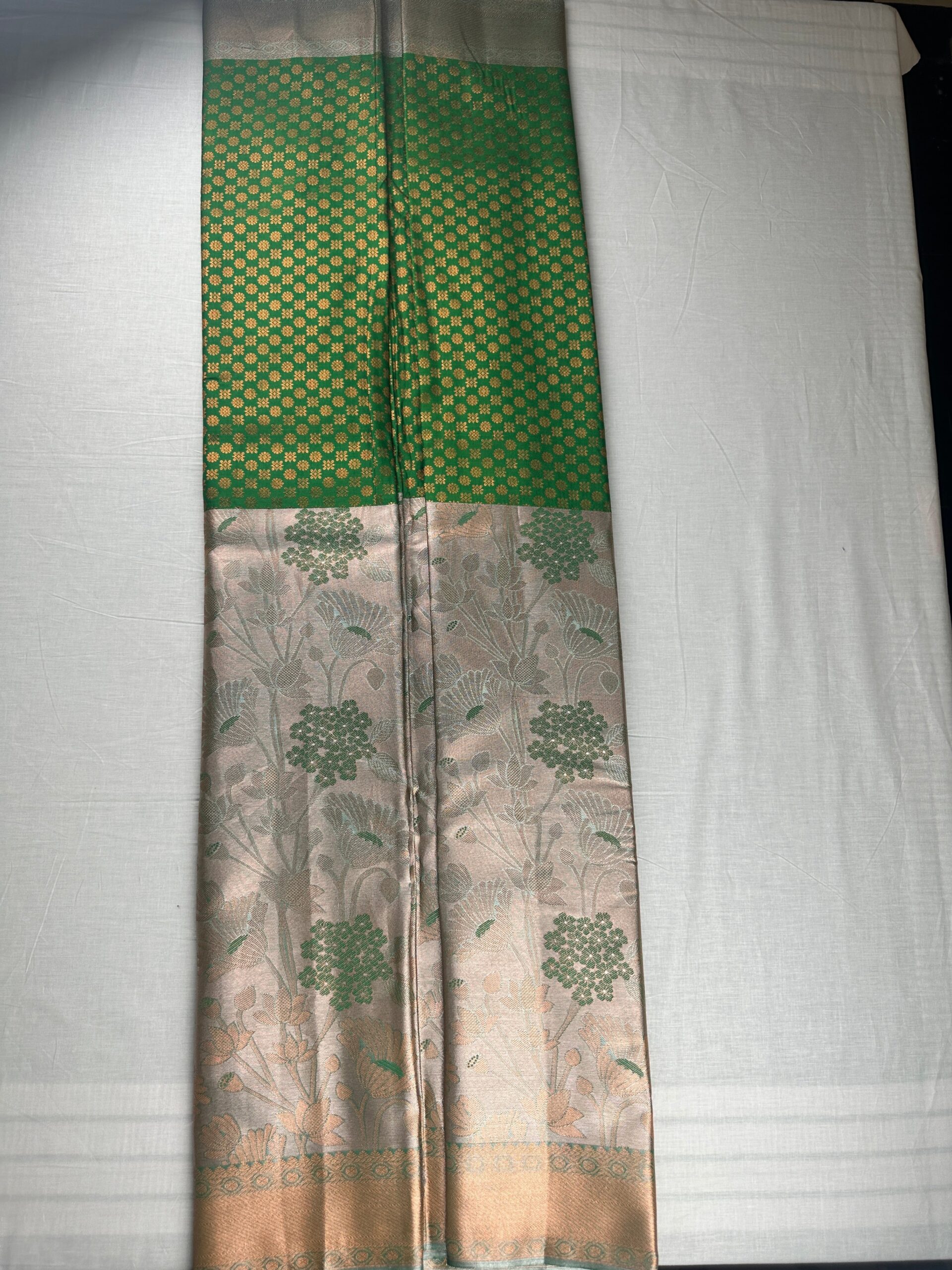 This saree is a classic example of traditional Indian craftsmanship. It is made of silk, giving it a light and airy feel. The beautiful green hue and intricate Kanjipuram weave make it a timeless piece for any traditional wardrobe.