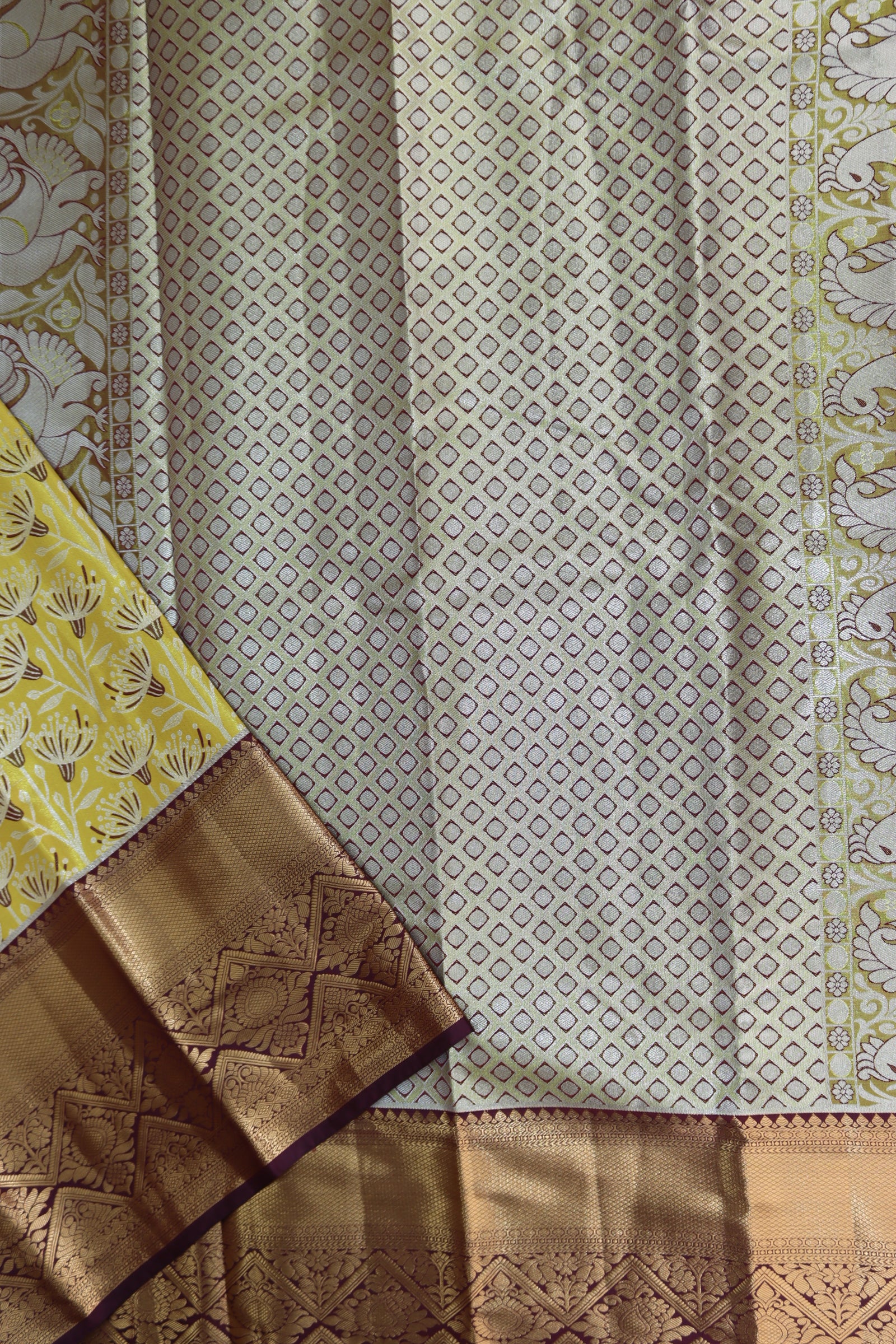 Enhance your fashion sense with our exquisite Yellow Kanjipuram Saree. Made from opulent silk, our Chic Yellow Saree showcases a majestic peach hue and polished pattern. Its accompanying blouse exudes grace and ease, ideal for all events. Immerse yourself in class and differentiate yourself with this product.