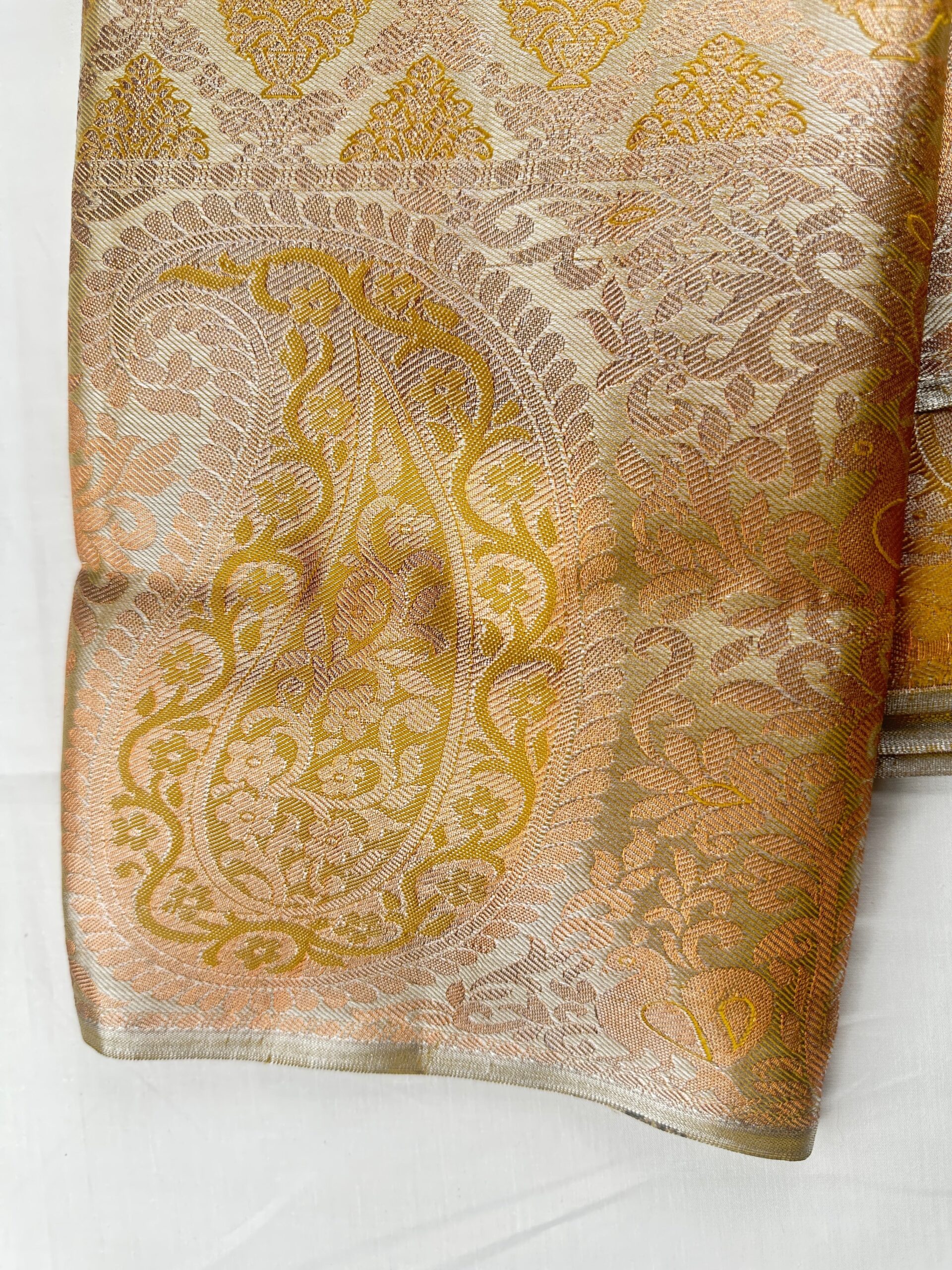Crafted from pure silk, this traditional yellow Kanjipuram saree is a timeless classic. Its luxurious fabric makes it lightweight and soft, yet strong and durable. Perfect for any occasion, this exquisite saree is sure to be cherished for years to come.