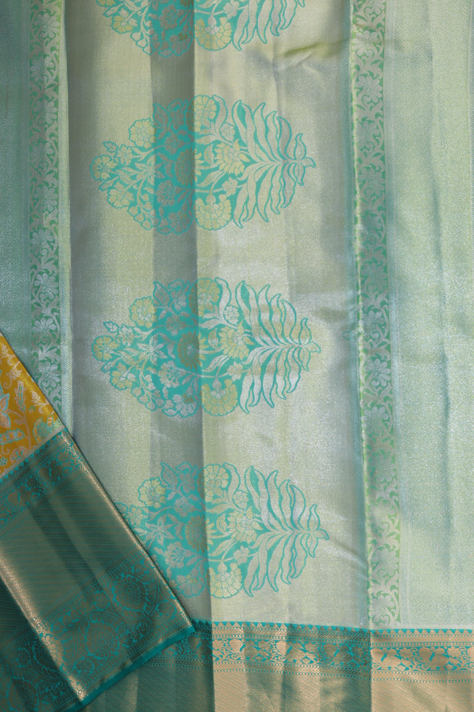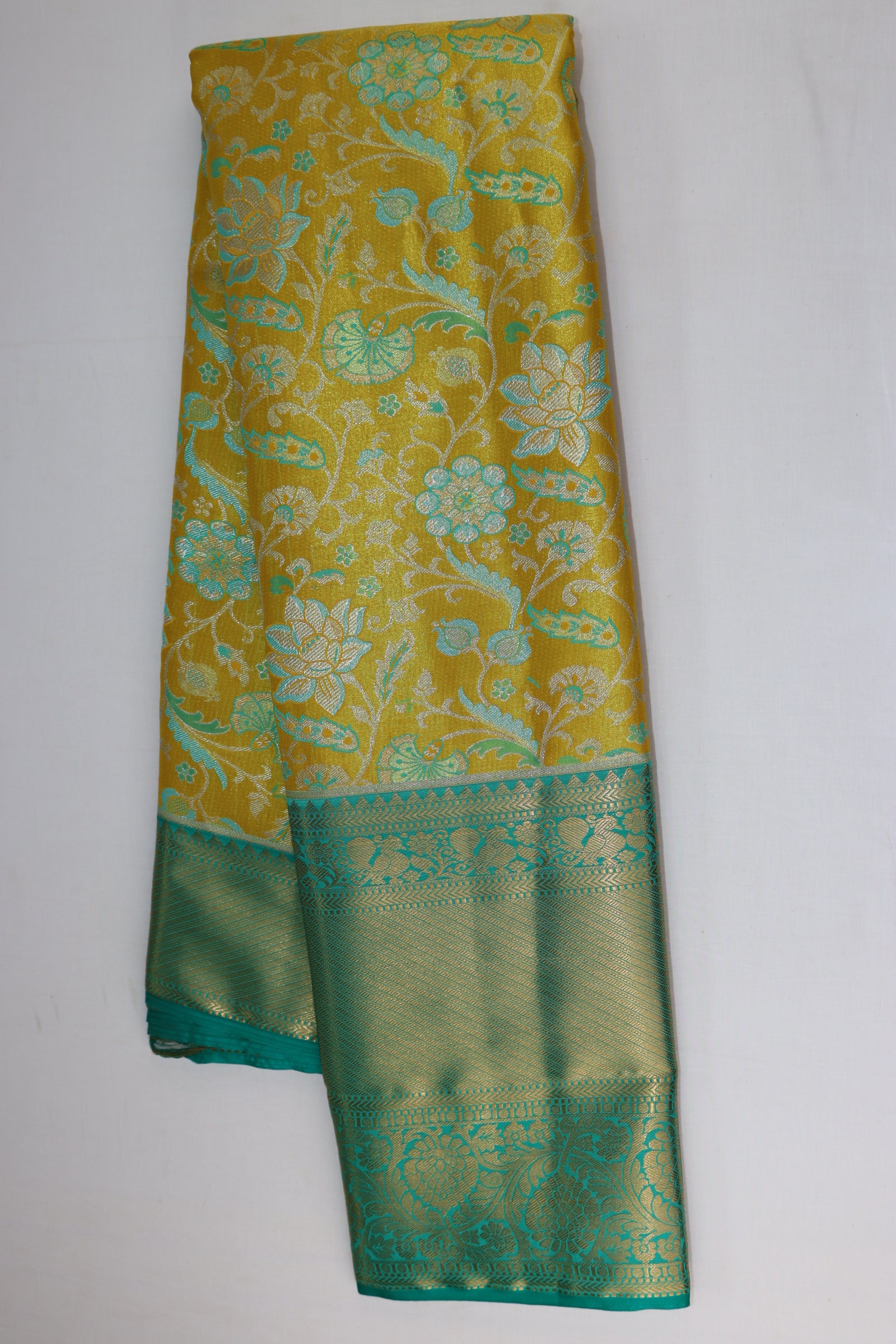 Indulge in sophistication with our Trendy Yellow Kanjipuram Saree, expertly crafted from luxurious silk. Its regal peach color, refined design, and matching blouse offer elegance and comfort, making it a must-have for any occasion. Elevate your style with our unparalleled Kanjipuram Saree.